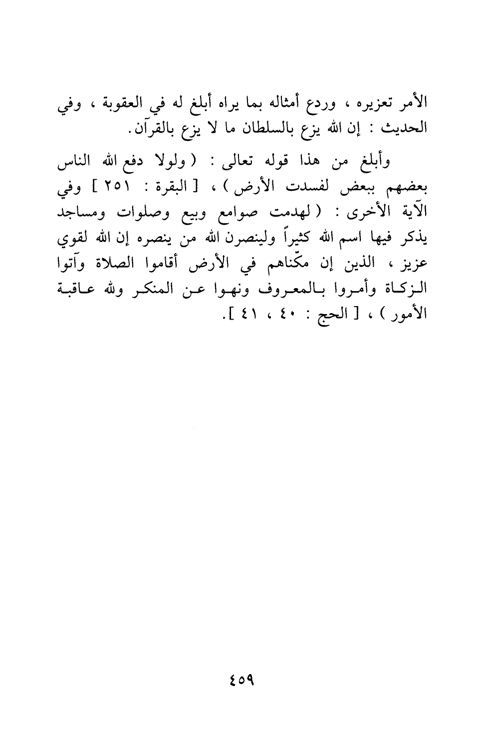 الأمر تعزيره، وردع أمثاله بما يراه أبلغ له في العقوبة، وفي الحديث: " إن الله يزع بالسلطان ما لا يزع بالقرآن ". وأبلغ من هذا، قوله تعالى: {وَلَوْلا دَفْعُ اللَّهِ النَّاسَ بَعْضَهُمْ بِبَعْضٍ لَفَسَدَتِ الْأَرْضُ} [سورة البقرة آية: 251] ، وفي الآية الأخرى: {لَهُدِّمَتْ صَوَامِعُ وَبِيَعٌ وَصَلَوَاتٌ وَمَسَاجِدُ يُذْكَرُ فِيهَا اسْمُ اللَّهِ كَثِيراً وَلَيَنْصُرَنَّ اللَّهُ مَنْ يَنْصُرُهُ إِنَّ اللَّهَ لَقَوِيٌّ عَزِيزٌ الَّذِينَ إِنْ مَكَّنَّاهُمْ فِي الْأَرْضِ أَقَامُوا الصَّلاةَ وَآتَوُا الزَّكَاةَ وَأَمَرُوا بِالْمَعْرُوفِ وَنَهَوْا عَنِ الْمُنْكَرِ وَلِلَّهِ عَاقِبَةُ الْأُمُورِ} [سورة الحج آية: 40-41] .
