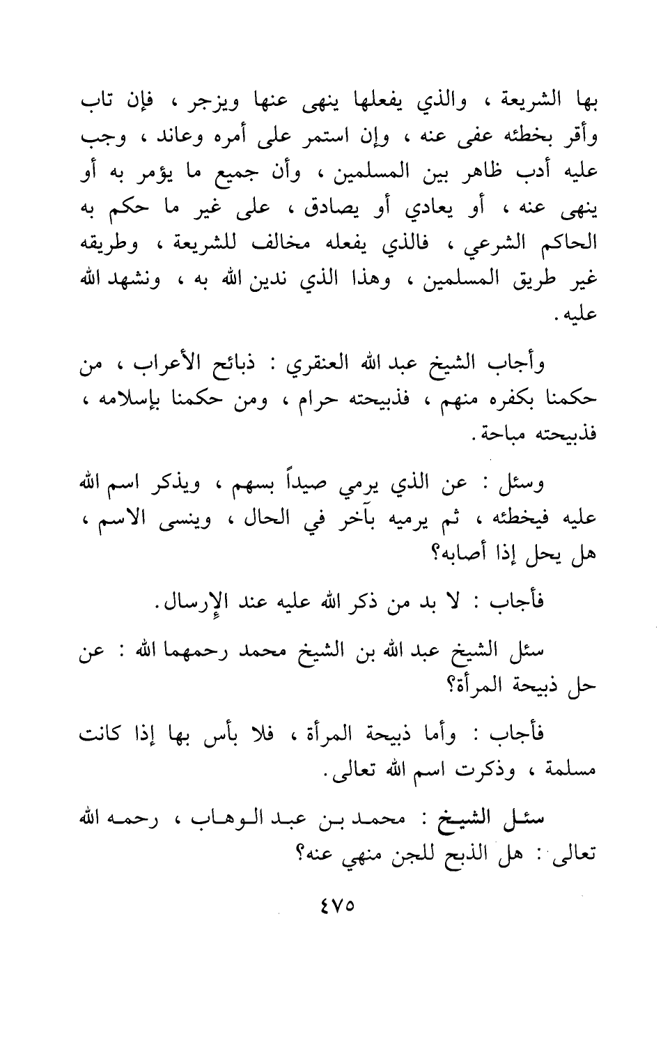 سئل الشيخ عبد الله بن الشيخ محمد، رحمهما الله: عن حل ذبيحة المرأة؟