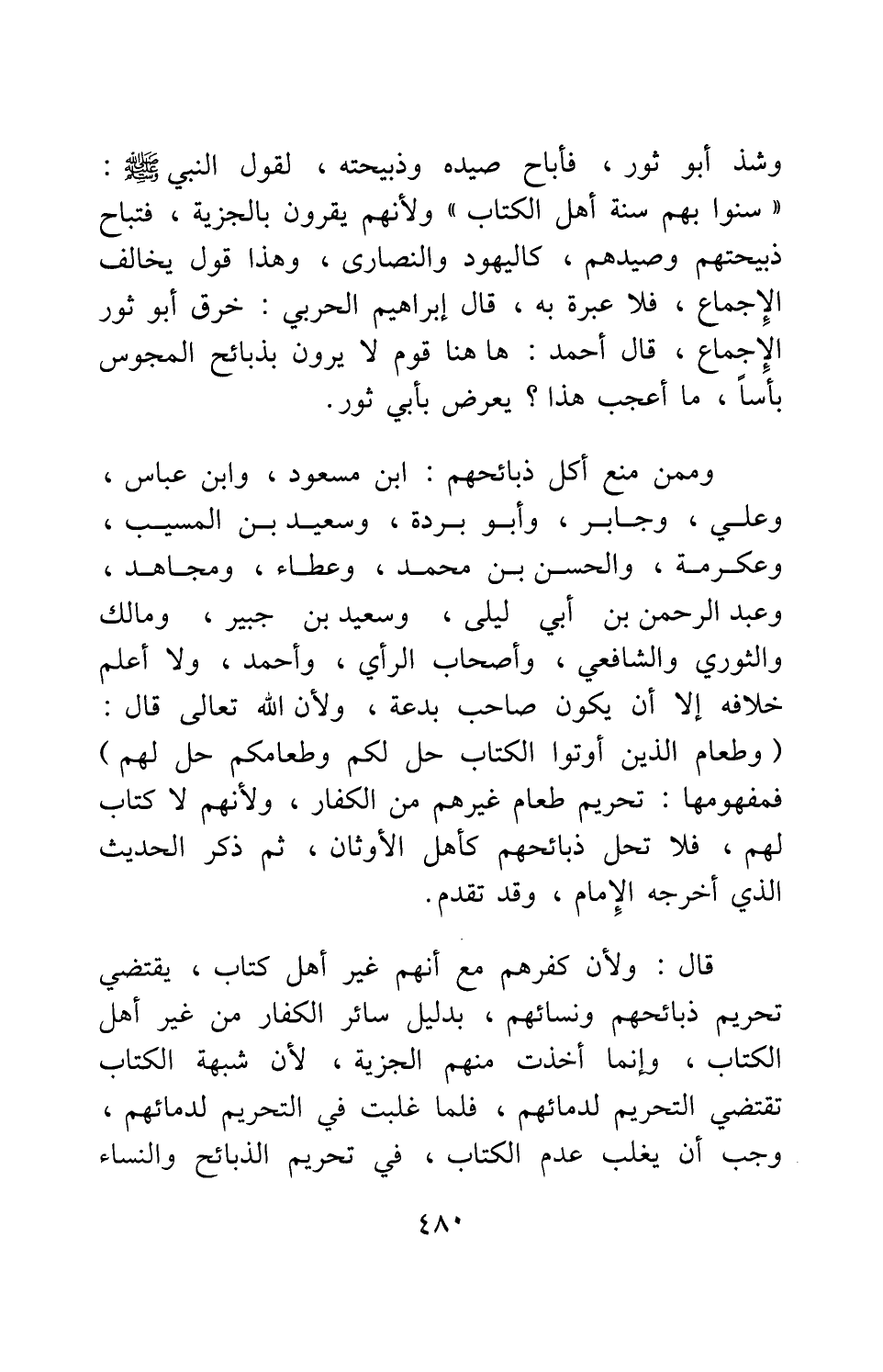 وممن منع أكل ذبائحهم: ابن مسعود، وابن عباس، وعلي، وجابر، وأبو بردة، وسعيد بن المسيب، وعكرمة، والحسن بن محمد، وعطاء، ومجاهد، وعبد الرحمن بن أبي ليلى، وسعيد بن جبير، ومالك، والثوري والشافعي، وأصحاب الرأي، وأحمد؛ ولا أعلم خلافه إلا أن يكون صاحب بدعة، ولأن الله تعالى قال: {وَطَعَامُ الَّذِينَ أُوتُوا الْكِتَابَ حِلٌّ لَكُمْ وَطَعَامُكُمْ حِلٌّ لَهُمْ} [سورة المائدة آية: 5] ، فمفهومها: تحريم طعام غيرهم من الكفار، ولأنهم لا كتاب لهم، فلا تحل ذبائحهم كأهل الأوثان، ثم ذكر الحديث الذي أخرجه الإمام، وقد تقدم. قال: ولأن كفرهم مع أنهم غير أهل كتاب، يقتضي تحريم ذبائحهم ونسائهم، بدليل سائر الكفار من غير أهل الكتاب، وإنما أخذت منهم الجزية، لأن شبهة الكتاب تقتضي التحريم لدمائهم، فلما غلبت في التحريم لدمائهم، وجب أن يغلب عدم الكتاب في تحريم الذبائح والنساء
