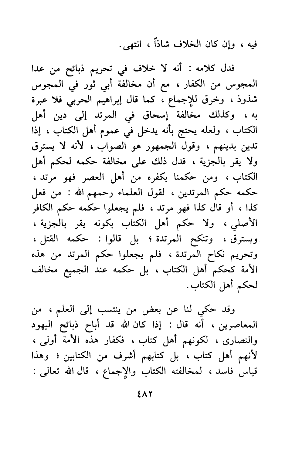 فدل كلامه: أنه لا خلاف في تحريم ذبائح من عدا المجوس من الكفار، مع أن مخالفة أبي ثور في المجوس شذوذ، وخرق للإجماع، كما قال إبراهيم الحربي، فلا عبرة به. وكذلك مخالفة إسحاق في المرتد إلى دين أهل الكتاب، ولعله يحتج بأنه يدخل في عموم أهل الكتاب إذا تدين بدينهم، وقول الجمهور هو الصواب، لأنه لا يسترق، ولا يقر بالجزية، فدل ذلك على مخالفة حكمه لحكم أهل الكتاب؛ ومن حكمنا بكفره من أهل العصر فهو مرتد، حكمه حكم المرتدين، لقول العلماء، رحمهم الله: من فعل كذا، أو قال كذا فهو مرتد، فلم يجعلوا حكمه حكم الكافر الأصلي، ولا حكم أهل الكتاب بكونه يقر بالجزية، ويسترق، وتنكح المرتدة، بل قالوا: حكمه القتل، وتحريم نكاح المرتدة، فلم يجعلوا حكم المرتد من هذه الأمة كحكم أهل الكتاب، بل حكمه عند الجميع مخالف لحكم أهل الكتاب.