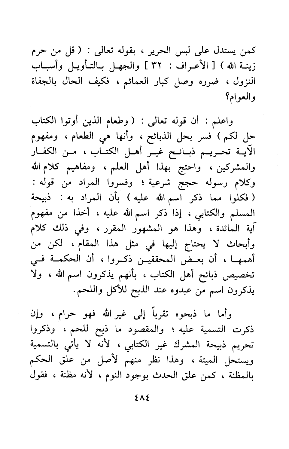 واعلم: أن قوله تعالى: {وَطَعَامُ الَّذِينَ أُوتُوا الْكِتَابَ حِلٌّ لَكُمْ} [سورة المائدة آية: 5] فسر بحل الذبائح، وأنها هي الطعام، ومفهوم الآية تحريم ذبائح غير أهل الكتاب، من الكفار والمشركين، واحتج بهذا أهل العلم؛ ومفاهيم كلام الله وكلام رسوله حجج شرعية. وفسروا المراد من قوله: {فَكُلُوا مِمَّا ذُكِرَ اسْمُ اللَّهِ عَلَيْهِ} [سورة الأنعام آية: 118] بأن المراد به: ذبيحة المسلم والكتابي، إذا ذكر اسم الله عليه، أخذاً من مفهوم آية المائدة؛ وهذا هو المشهور المقرر، وفي ذلك كلام وأبحاث لا يحتاج إليها في مثل هذا المقام، لكن من أهمها، أن بعض المحققين ذكروا أن الحكمة في تخصيص ذبائح أهل الكتاب، بأنهم يذكرون اسم الله، ولا يذكرون اسم من عبدوه عند الذبح للأكل واللحم. وأما ما ذبحوه تقرباً إلى غير الله فهو حرام، وإن ذكرت التسمية عليه، والمقصود ما ذبح للحم. وذكروا تحريم ذبيحة المشرك غير الكتابي، لأنه لا يأتي بالتسمية، ويستحل الميتة؛ وهذا نظر منهم لأصل من علق الحكم بالمظنَّة، كمن علق الحدث بوجود النوم، لأنه مظنة. فقول