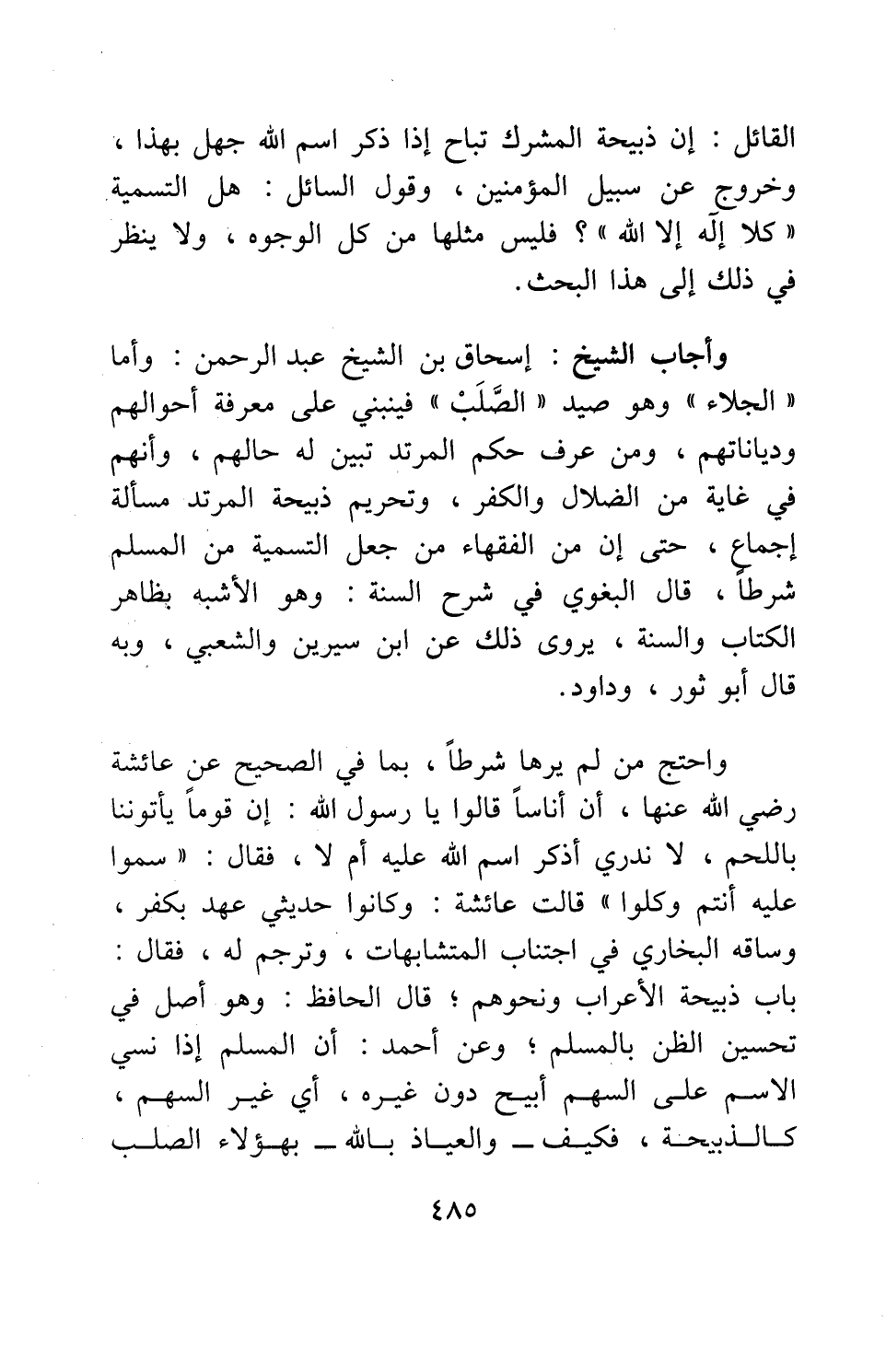 وأجاب الشيخ إسحاق بن الشيخ عبد الرحمن: وأما الجلاء، وهو صيد الصَّلَب، فينبني على معرفة أحوالهم ودياناتهم؛ ومن عرف حكم المرتد تبين له حالهم، وأنهم في غاية من الضلال والكفر. وتحريم ذبيحة المرتد مسألة إجماع، حتى إن من الفقهاء من جعل التسمية من المسلم شرطاً؛ قال البغوي في شرح السنة: وهو الأشبه بظاهر الكتاب والسنة، يروى ذلك عن ابن سيرين والشعبي، وبه قال أبو ثور، وداود. واحتج من لم يرها شرطاً، بما في الصحيح عن عائشة، رضي الله عنها: " أن أناساً قالوا: يا رسول الله، إن قوما يأتوننا باللحم، لا ندري أذكر اسم الله عليه أم لا، فقال: سموا عليه أنتم وكلوا. قالت عائشة: وكانوا حديثي عهد بكفر " 1، وساقه البخاري في اجتناب المتشابهات، وترجم له، فقال: باب ذبيحة الأعراب ونحوهم; قال الحافظ: وهو أصل في تحسين الظن بالمسلم. وعن أحمد: أن المسلم إذا نسي الاسم على السهم أبيح دون غيره، أي غير السهم، كالذبيحة، فكيف - والعياذ بالله - بهؤلاء الصلب