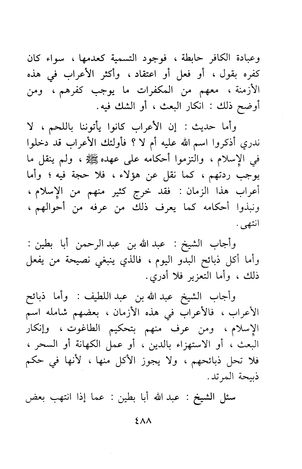وأجاب الشيخ عبد الله بن عبد اللطيف: وأما ذبائح الأعراب، فالأعراب في هذه الأزمان، بعضهم شامله اسم الإسلام، ومن عرف منهم بتحكيم الطاغوت، وإنكار البعث، أو الاستهزاء بالدين، أو عمل الكهانة أو السحر، فلا تحل ذبائحهم، ولا يجوز الأكل منها، لأنها في حكم ذبيحة المرتد.