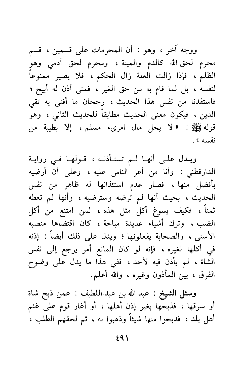 ووجه آخر، وهو: أن المحرمات على قسمين: قسم محرم لحق الله، كالدم والميتة، ومحرم لحق آدمي وهو الظلم؛ فإذا زالت العلة زال الحكم، فلا يصير ممنوعاً لنفسه، بل لما قام به من حق الغير، فمتى أذن له أبيح، فاستفدنا من نفس هذا الحديث رجحان ما أفتى به تقي الدين، فيكون معنى الحديث مطابقاً للحديث الثاني: وهو قوله صلى الله عليه وسلم: " لا يحل مال امرئ مسلم إلا بطيبة من نفسه " 1. ويدل على أنها لم تستأذنه: قولها في رواية الدارقطني: وأنا من أعز الناس عليه، وعلي أن أرضيه بأفضل منها، فصار عدم استئذانها له ظاهر من نفس الحديث، بحيث أنها لم ترضه وسترضيه، وأنها لم تعطه ثمناً، فكيف يسوغ أكل مثل هذه، لمن امتنع من أكل الضب، وترك أشياء عديدة مباحة، كان اقتضاها منصبه الأسنى، والصحابة يفعلونها; ويدل على ذلك أيضاً: إذنه في أكلها لغيره، فإنه لو كان المانع أمر يرجع إلى نفس الشاة، لم يأذن فيه لأحد، ففي هذا ما يدل على وضوح الفرق بين المأذون وغيره، والله أعلم.