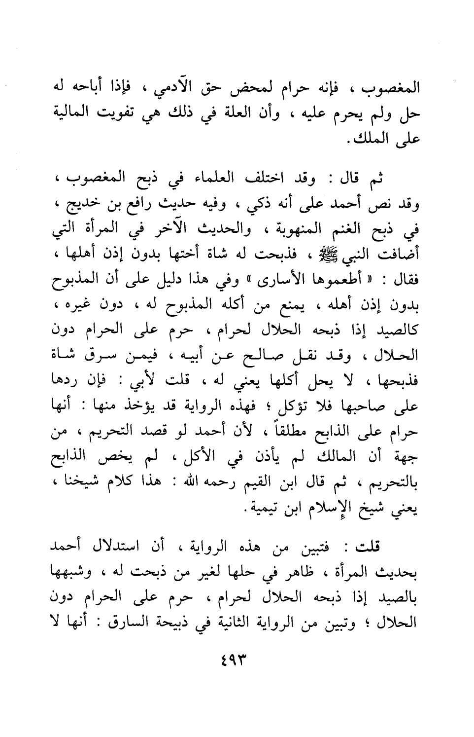 ثم قال: وقد اختلف العلماء في ذبح المغصوب، وقد نص أحمد على أنه ذكي، وفيه حديث رافع بن خديج، في ذبح الغنم المنهوبة، والحديث الآخر في المرأة التي أضافت النبي صلى الله عليه وسلم فذبحت له شاة أختها بدون إذن أهلها، فقال: " أطعموها الأسارى " 1، وفي هذا دليل على أن المذبوح بدون إذن أهله يمنع من أكله المذبوح له، دون غيره، كالصيد إذا ذبحه الحلال لحرام، حرم على الحرام دون الحلال. وقد نقل صالح عن أبيه، فيمن سرق شاة فذبحها، لا يحل أكلها يعني له، قلت لأبي: فإن ردها على صاحبها فلا تؤكل، فهذه الرواية قد يؤخذ منها: أنها حرام على الذابح مطلقاً، لأن أحمد لو قصد التحريم من جهة أن المالك لم يأذن في الأكل، لم يخص الذابح بالتحريم. ثم قال ابن القيم، رحمه الله: هذا كلام شيخنا، يعني شيخ الإسلام ابن تيمية. قلت: فتبين من هذه الرواية، أن استدلال أحمد بحديث المرأة ظاهر في حلها لغير من ذبحت له، وشبهها بالصيد إذا ذبحه الحلال لحرام، حرم على الحرام دون الحلال; وتبين من الرواية الثانية في ذبيحة السارق: أنها لا