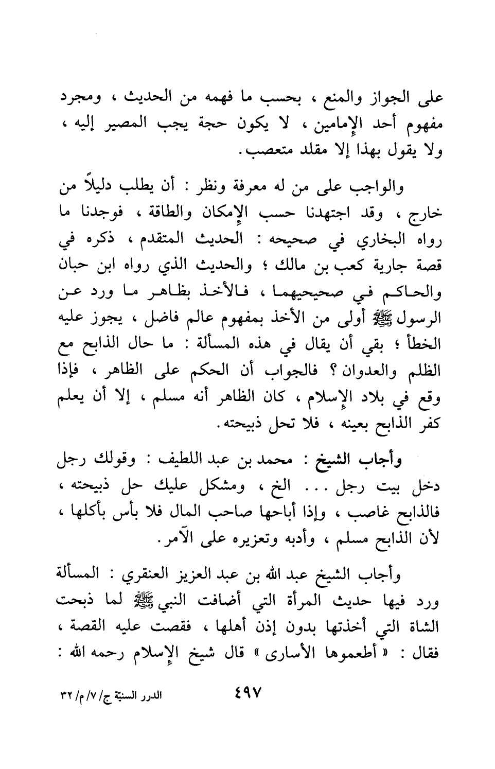 والواجب على من له معرفة ونظر: أن يطلب دليلاً من خارج، وقد اجتهدنا حسب الإمكان والطاقة، فوجدنا ما رواه البخاري في صحيحه، الحديث المتقدم ذكره في قصة جارية كعب بن مالك، والحديث الذي رواه ابن حبان والحاكم في صحيحيهما؛ فالأخذ بظاهر ما ورد عن الرسول صلى الله عليه وسلم أولى من الأخذ بمفهوم عالم فاضل، يجوز عليه الخطأ. بقي أن يقال في هذه المسألة: ما حال الذابح مع الظلم والعدوان؟ فالجواب أن الحكم على الظاهر: فإذا وقع في بلاد الإسلام، كان الظاهر أنه مسلم، إلا أن يعلم كفر الذابح بعينه، فلا تحل ذبيحته.