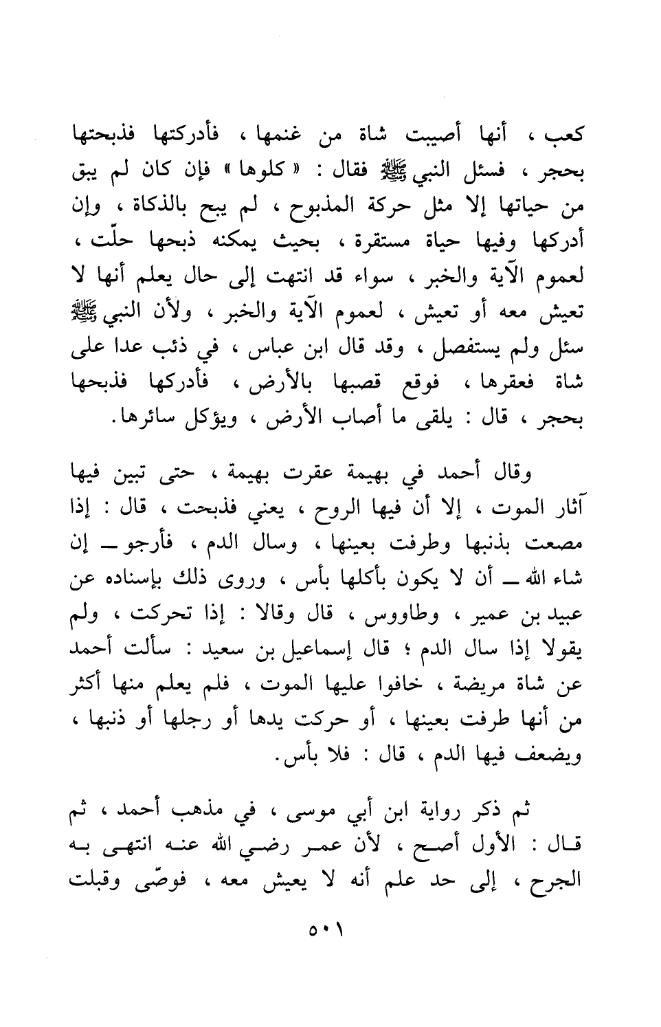 كعب، أنها أصيبت شاة من غنمها، فأدركتها فذبحتها بحجر، فسئل النبي صلى الله عليه وسلم فقال: "كلوها"، فإن كان لم يبق من حياتها إلا مثل حركة المذبوح، لم يبح بالذكاة، وإن أدركها وفيها حياة مستقرة، بحيث يمكنه ذبحها حلت، لعموم الآية والخبر، سواء قد انتهت إلى حال يعلم أنها لا تعيش معه أو تعيش، لعموم الآية والخبر، ولأن النبي صلى الله عليه وسلم سئل ولم يستفصل؛ وقد قال ابن عباس، في ذئب عدا على شاة فعقرها، فوقع قصبها بالأرض، فأدركها فذبحها بحجر، قال: "يلقى ما أصاب الأرض، ويؤكل سائرها".