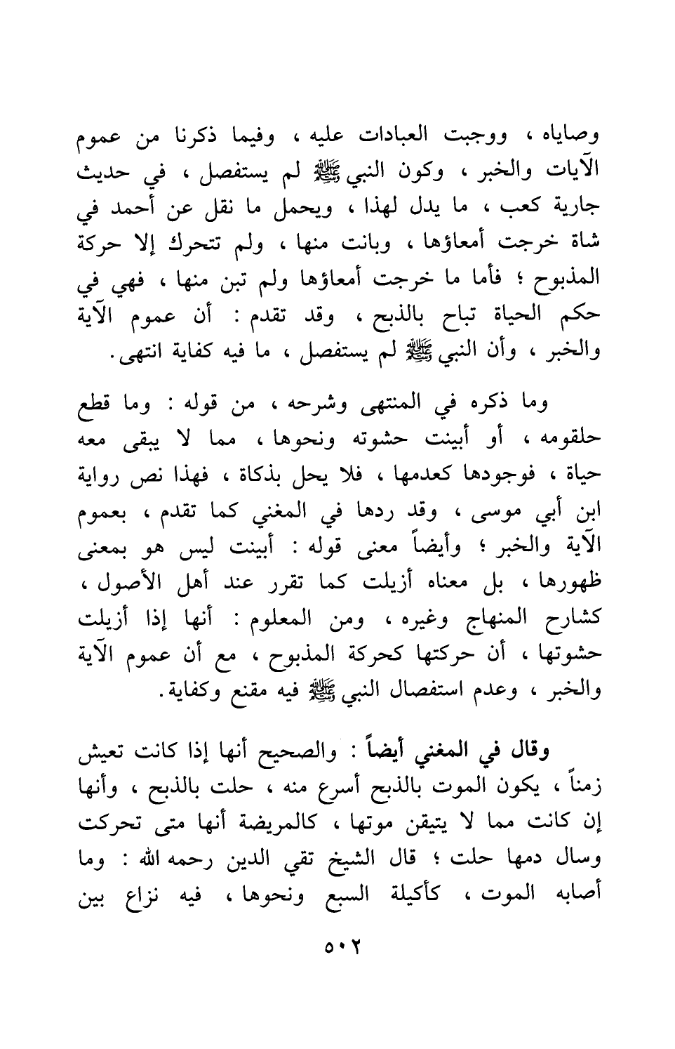 وصاياه، ووجبت العبادات عليه. وفيما ذكرنا من عموم الآيات والخبر، وكون النبي صلى الله عليه وسلم لم يستفصل في حديث جارية كعب، ما يدل لهذا، ويحمل ما نقل عن أحمد في شاة خرجت أمعاؤها، وبانت منها، ولم تتحرك إلا حركة المذبوح; فأما ما خرجت أمعاؤها ولم تبن منها، فهي في حكم الحياة تباح بالذبح؛ وقد تقدم: أن عموم الآية والخبر، وأن النبي صلى الله عليه وسلم لم يستفصل، ما فيه كفاية. انتهى.