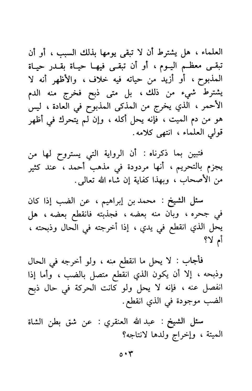 سئل الشيخ محمد بن إبراهيم، عن الضب إذا كان في جحره، وبان منه بعضه، فجذبته فانقطع بعضه هل يحل الذي انقطع في يدي، إذا أخرجته في الحال وذبحته، أم لا؟