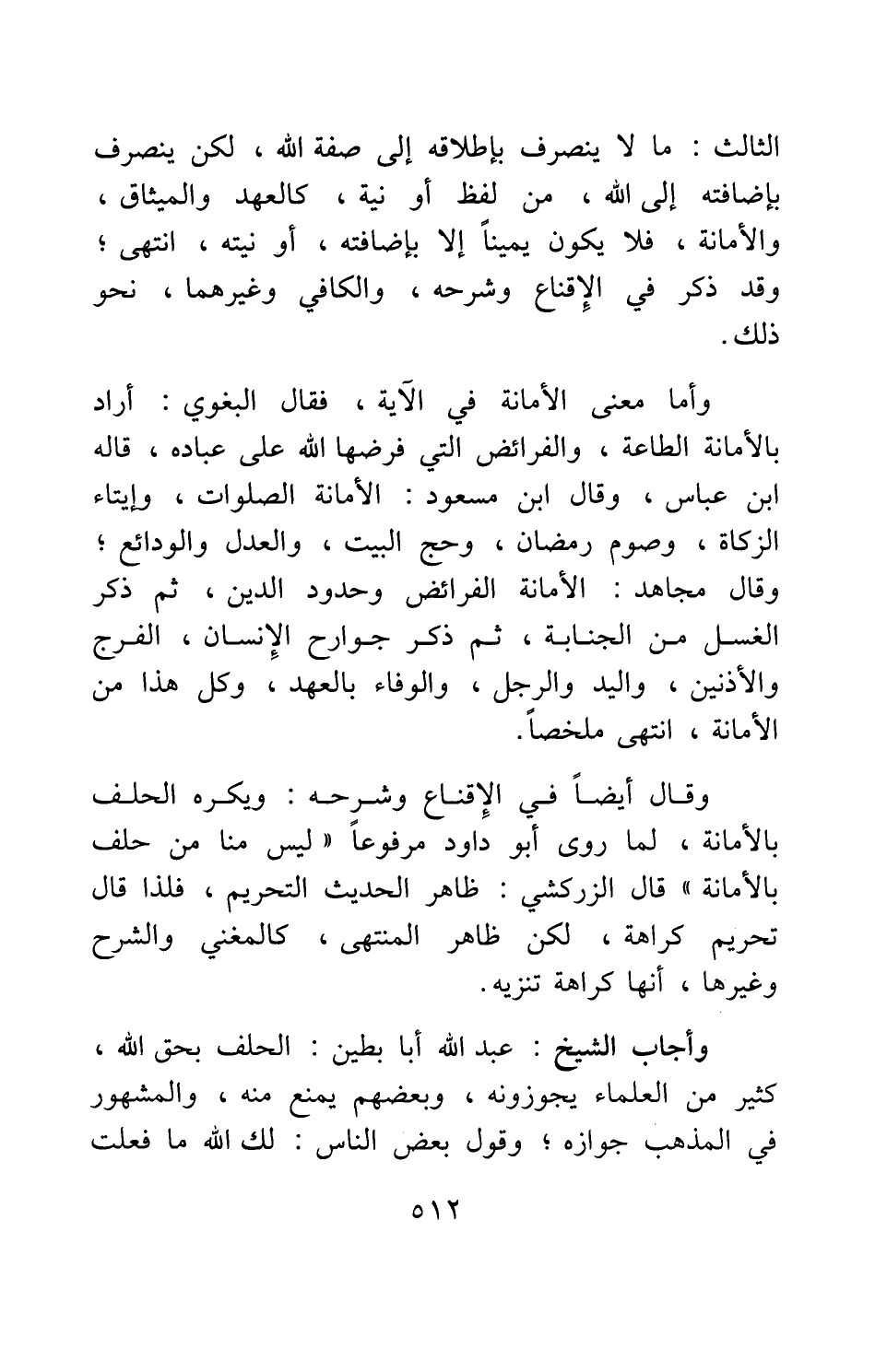 الثالث: ما لا ينصرف بإطلاقه إلى صفة الله، لكن ينصرف بإضافته إلى الله، من لفظ أو نية، كالعهد، والميثاق، والأمانة، فلا يكون يميناً إلا بإضافته، أو نيته. انتهى. وقد ذكر في الإقناع وشرحه، والكافي وغيرهما، نحو ذلك.