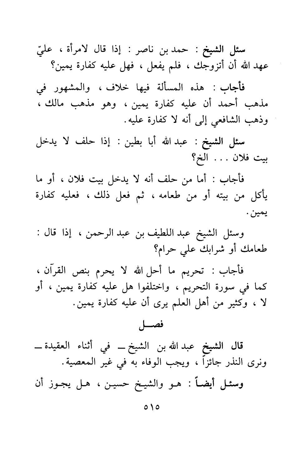 قال الشيخ عبد الله بن الشيخ - في أثناء العقيدة -: ونرى النذر جائزاً، ويجب الوفاء به في غير المعصية.