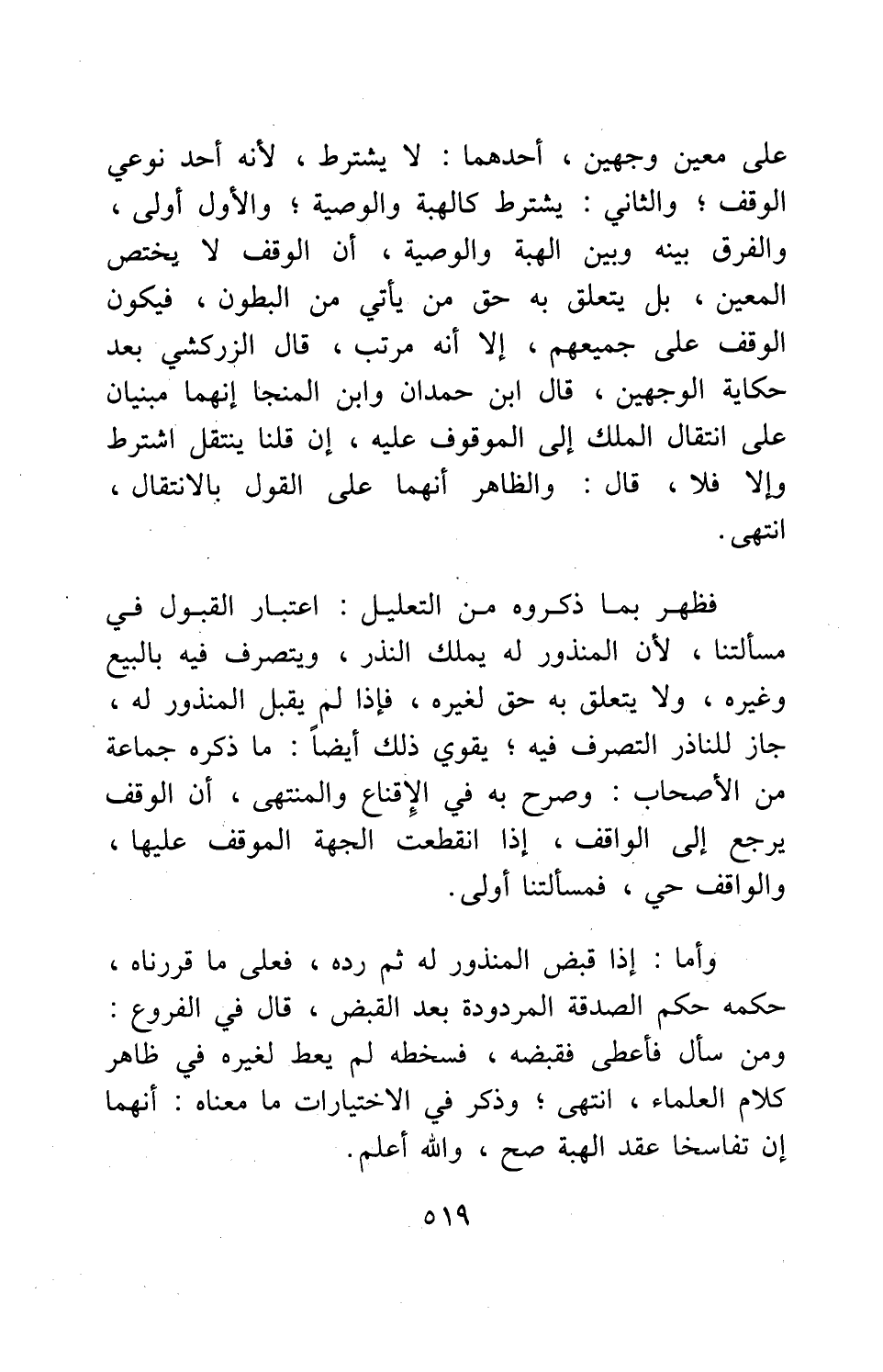 فظهر بما ذكروه من التعليل: اعتبار القبول في مسألتنا، لا المنذور له، يملك النذر، ويتصرف فيه بالبيع وغيره، ولا يتعلق به حق لغيره، فإذا لم يقبل المنذور له، جاز للناذر التصرف فيه; يقوي ذلك أيضاً: ما ذكره جماعة من الأصحاب، وصرح به في الإقناع والمنتهى: أن الوقف يرجع إلى الواقف، إذا انقطعت الجهة الموقف عليها، والواقف حي، فمسألتنا أولى.