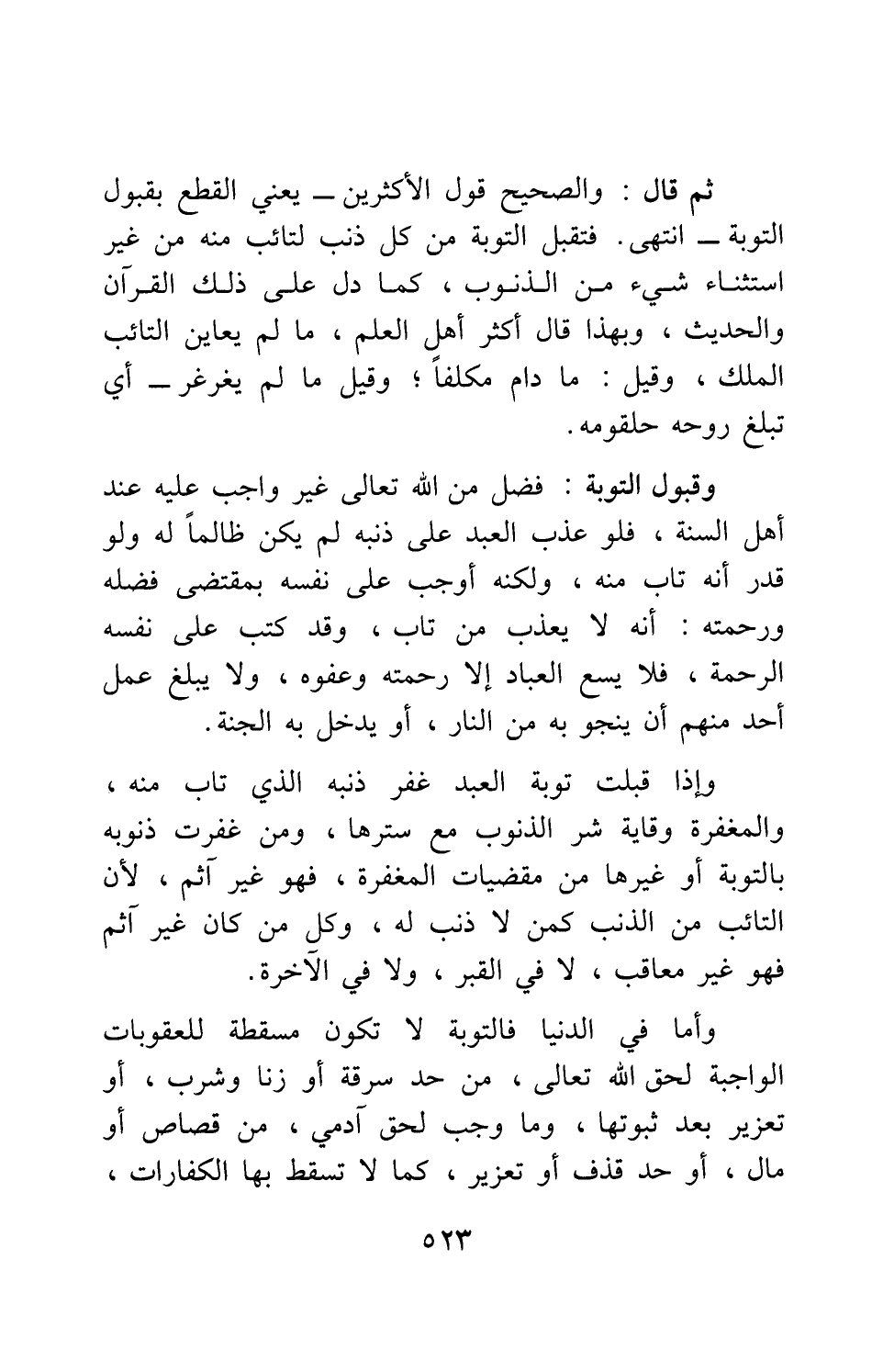 ثم قال: والصحيح قول الأكثرين - يعني القطع بقبول التوبة -. انتهى. فتقبل التوبة من كل ذنب لتائب منه من غير استثناء شيء من الذنوب، كما دل على ذلك القرآن والحديث، وبهذا قال أكثر أهل العلم، ما لم يعاين التائب الملَك، وقيل: ما دام مكلفاً; وقيل ما لم يغرغر - أي تبلغ روحه حلقومه -.