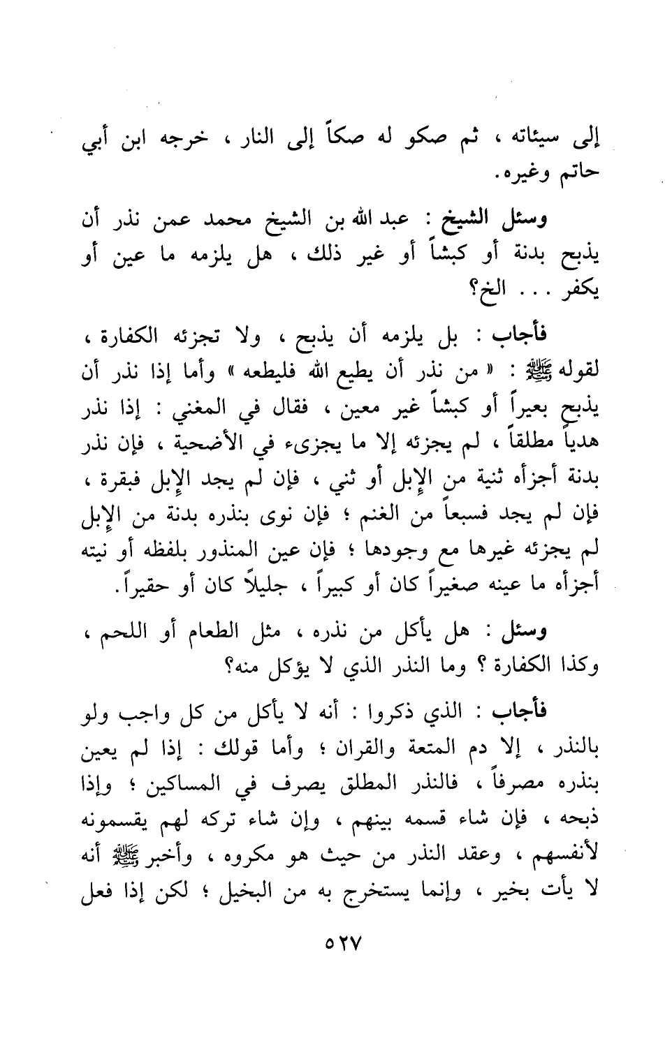 وسئل الشيخ عبد الله بن الشيخ محمد: عمن نذر أن يذبح بدنة أو كبشاً أو غير ذلك، هل يلزمه ما عين أو يكفِّر ... إلخ؟
