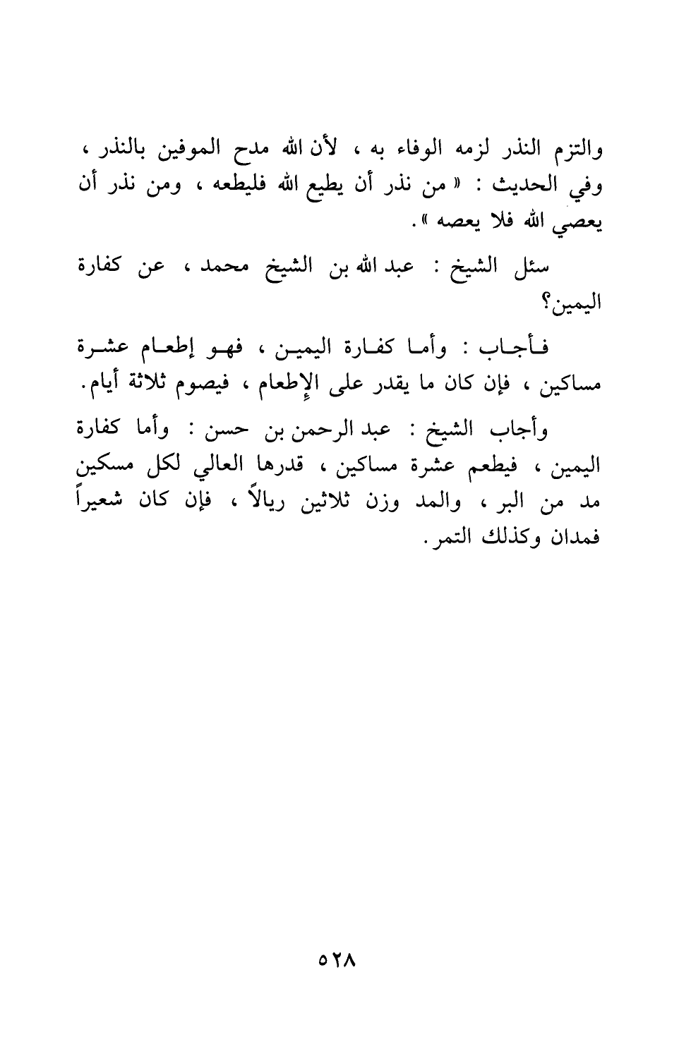 وأجاب الشيخ عبد الرحمن بن حسن: وأما كفارة اليمين، فيطعم عشرة مساكين، قدرها العالي لكل مسكين مد من البر، والمد وزن ثلاثين ريالاً، فإن كان شعيراً فمُدَّان وكذلك التمر.