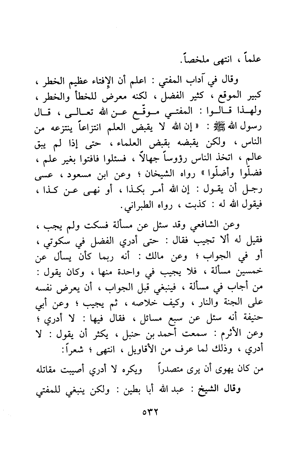 وقال في آداب المفتي: اعلم أن الإفتاء عظيم الخطر، كبير الموقع، كثير الفضل، لكنه معرض للخطإ والخطر، ولهذا قالوا: المفتي مُوَقِّع عن الله تعالى، قال رسول الله صلى الله عليه وسلم: " إن الله لا يقبض العلم انتزاعاً ينتزعه من الناس، ولكن يقبضه بقبض العلماء، حتى إذا لم يبق عالم، اتخذ الناس رؤوساً جهالاً، فسئلوا فأفتوا بغير علم، فضلوا وأضلوا " 1، رواه الشيخان. وعن ابن مسعود: "عسى رجل أن يقول: إن الله أمر بكذا، أو نهى عن كذا، فيقول الله له: كذبت"، رواه الطبراني.