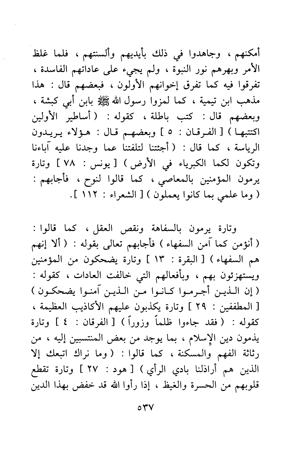 أمكنهم، وجاهدوا في ذلك بأيديهم وألسنتهم. فلما غلظ الأمر وبهرهم نور النبوة، ولم يجيء على عاداتهم الفاسدة، تفرقوا فيه كما تفرق إخوانهم الأولون: فبعض قال: هذا مذهب ابن تيمية، كما لمزوا رسول الله صلى الله عليه وسلم بابن أبي كبشة، وبعضهم قال: كتب باطلة، كقوله: {أَسَاطِيرُ الْأَوَّلِينَ اكْتَتَبَهَا} [سورة الفرقان آية: 5] ، وبعضهم قال: هؤلاء يريدون الرياسة، كما قال: {قَالُوا أَجِئْتَنَا لِتَلْفِتَنَا عَمَّا وَجَدْنَا عَلَيْهِ آبَاءَنَا وَتَكُونَ لَكُمَا الْكِبْرِيَاءُ فِي الْأَرْضِ} [سورة يونس آية: 78] ، وتارة يرمون المؤمنين بالمعاصي، كما قالوا لنوح، فأجابهم: {وَمَا عِلْمِي بِمَا كَانُوا يَعْمَلُونَ} [سورة الشعراء آية: 112] ، وتارة يرمون بالسفاهة ونقص العقل، كما قالوا: {أَنُؤْمِنُ كَمَا آمَنَ السُّفَهَاءُ} [سورة البقرة آية: 13] ، فأجابهم تعالى بقوله: {أَلا إِنَّهُمْ هُمُ السُّفَهَاءُ} [سورة البقرة آية: 13] ، وتارة يضحكون من المؤمنين ويستهزئون بهم، وبأفعالهم التي خالفت العادات، كقوله: {إِنَّ الَّذِينَ أَجْرَمُوا كَانُوا مِنَ الَّذِينَ آمَنُوا يَضْحَكُونَ} [سورة المطففين آية: 29] ، وتارة يكذبون عليهم الأكاذيب العظيمة، كقوله: {فَقَدْ جَاءُوا ظُلْماً وَزُوراً} [سورة الفرقان آية: 4] ، وتارة يذمون دين الإسلام، بما يوجد من بعض المنتسبين إليه، من رثاثة الفهم والمسكنة، كما قالوا: {وَمَا نَرَاكَ اتَّبَعَكَ إِلَّا الَّذِينَ هُمْ أَرَاذِلُنَا بَادِيَ الرَّأْيِ} [سورة هود آية: 27] ، وتارة تقطع قلوبهم من الحسرة والغيظ، إذا رأوا الله قد خفض بهذا الدين