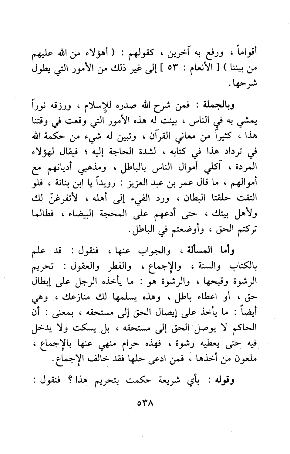 وبالجملة: فمن شرح الله صدره للإسلام، ورزقه نوراً يمشي به في الناس، بينت له هذه الأمور التي وقعت في وقتنا هذا، كثيراً من معاني القرآن، وتبين له شيء من حكمة الله في ترداد هذا في كتابه، لشدة الحاجة إليه; فيقال لهؤلاء المردة، آكلي أموال الناس بالباطل، ومذهبي أديانهم مع أموالهم، ما قال عمر بن عبد العزيز: "رويداً يا ابن بنانة! فلو التقت حلقتا البطان، ورد الفيء إلى أهله، لأتفرغن لك ولأهل بيتك، حتى أدعهم على المحجة البيضاء؛ فطالما تركتم الحق، وأوضعتم في الباطل".
