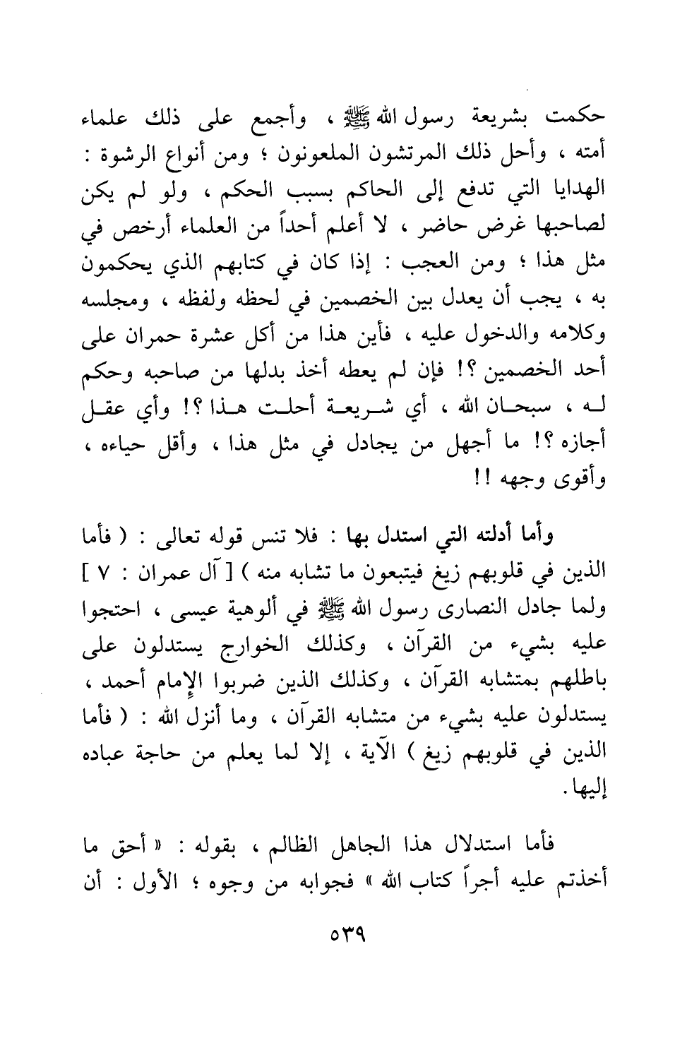 وأما أدلته التي استدل بها، فلا تنس قوله تعالى: {فَأَمَّا الَّذِينَ فِي قُلُوبِهِمْ زَيْغٌ فَيَتَّبِعُونَ مَا تَشَابَهَ مِنْهُ} [سورة آل عمران آية: 7] ؛ ولما جادل النصارى رسول الله صلى الله عليه وسلم في ألوهية عيسى، احتجوا عليه بشيء من القرآن، وكذلك الخوارج يستدلون على باطلهم بمتشابه القرآن، وكذلك الذين ضربوا الإمام أحمد، يستدلون عليه بشيء من متشابه القرآن، وما أنزل الله: {فَأَمَّا الَّذِينَ فِي قُلُوبِهِمْ زَيْغٌ} الآية [سورة آل عمران آية: 7] ، إلا لما يعلم من حاجة عباده إليها.