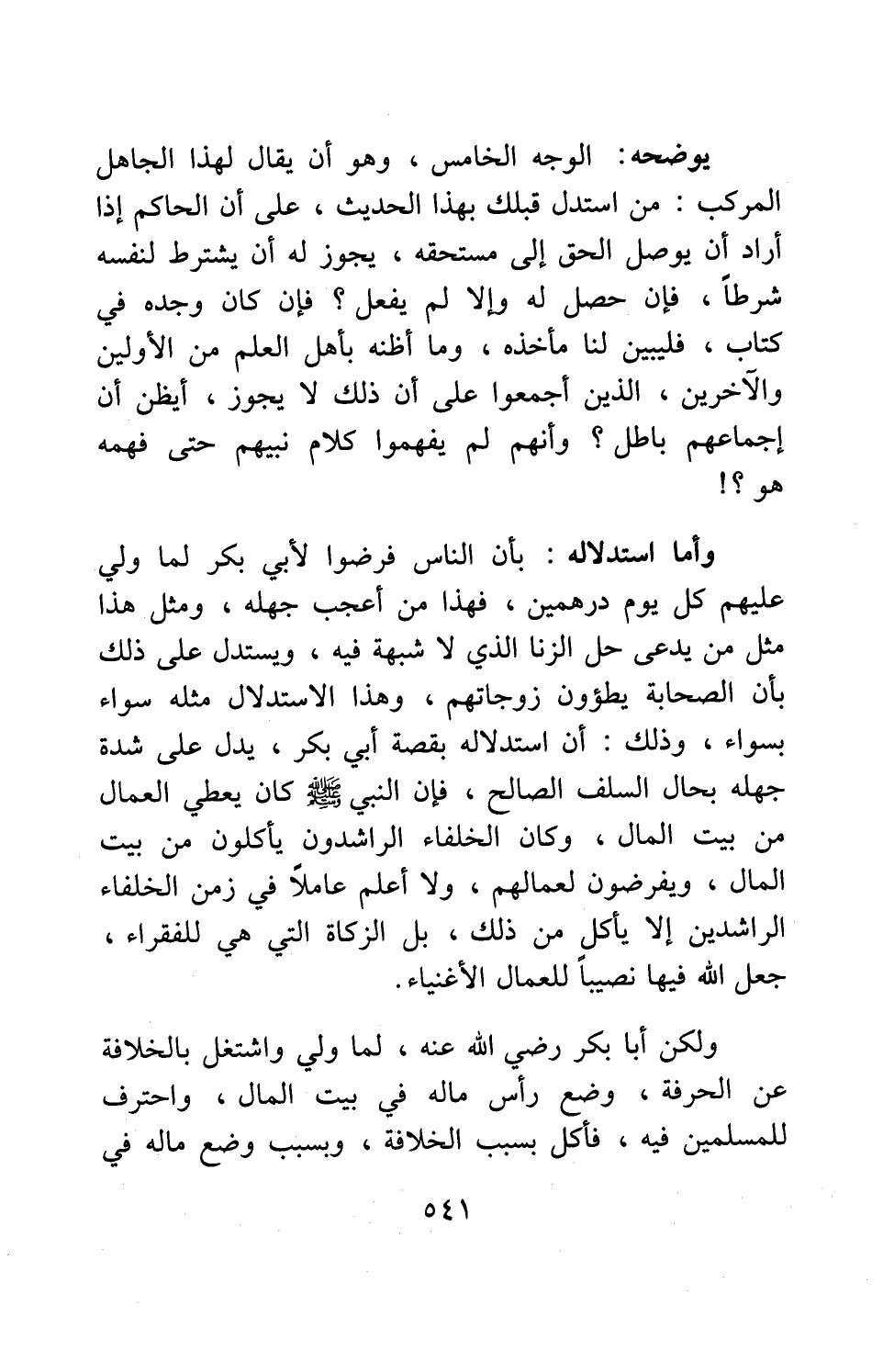 يوضحه الوجه الخامس الوجه الخامس: وهو أن يقال: هذا الجاهل المركب، من استدل قبلك بهذا الحديث، على أن الحاكم إذا أراد أن يوصل الحق إلى مستحقه، يجوز له أن يشترط لنفسه شرطاً، فإن حصل له وإلا لم يفعل، فإن كان وجده في كتاب، فليبين لنا مأخذه، وما أظنه بأهل العلم من الأولين والآخرين، الذين أجمعوا على أن ذلك لا يجوز، أيظن أن إجماعهم باطل؟ وأنهم لم يفهموا كلام نبيهم حتى فهمه هو؟! وأما استدلاله: بأن الناس فرضوا لأبي بكر لما ولي عليهم كل يوم درهمين، فهذا من أعجب جهله، ومثل هذا مثل من يدعي حل الزنى الذي لا شبهة فيه، ويستدل على ذلك بأن الصحابة يطؤون زوجاتهم، وهذا الاستدلال مثله سواء بسواء، وذلك، أن استدلاله بقصة أبي بكر يدل على شدة جهله بحال السلف الصالح؛ فإن النبي صلى الله عليه وسلم كان يعطي العمال من بيت المال، وكان الخلفاء الراشدون يأكلون من بيت المال، ويفرضون لعمالهم، ولا أعلم عاملاً في زمن الخلفاء الراشدين إلا يأكل من ذلك، بل الزكاة التي هي للفقراء، جعل الله فيها نصيباً للعمال الأغنياء.