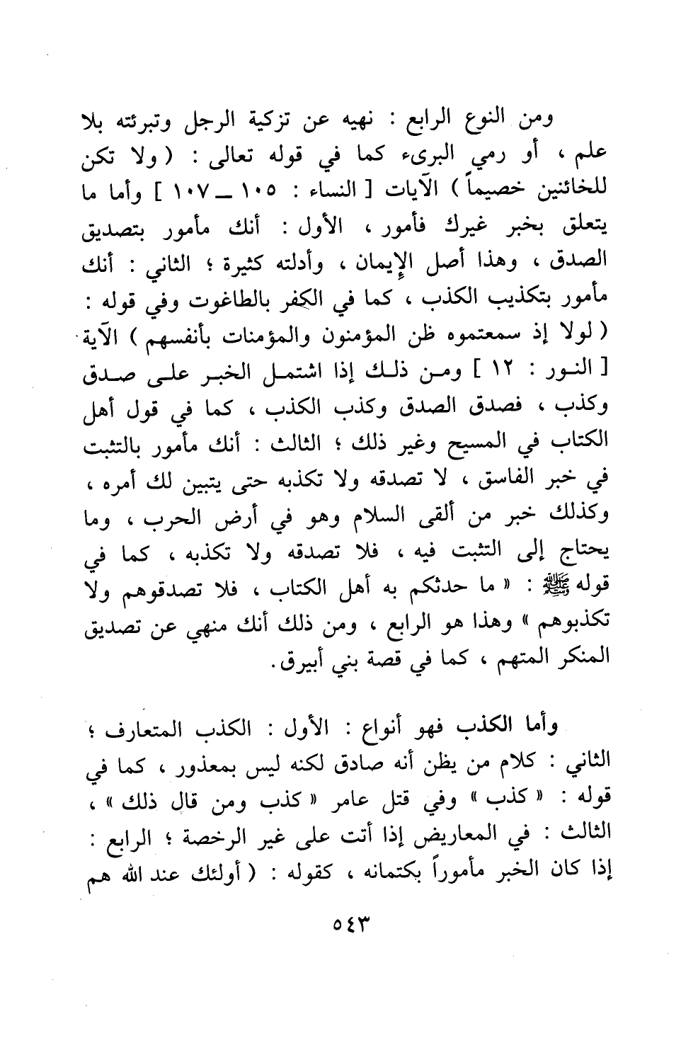 الثالث: أنك مأمور بالتثبت في خبر الفاسق، لا تصدقه ولا تكذبه حتى يتبين لك أمره، وكذلك خبر من ألقى السلام وهو في أرض الحرب، وما يحتاج إلى التثبت فيه، فلا تصدقه ولا تكذبه، كما في قوله صلى الله عليه وسلم: "ما حدثكم به أهل الكتاب، فلا تصدقوهم ولا تكذبوهم " 1؛ وهذا هو الرابع. ومن ذلك أنك منهي عن تصديق المنكر المتهم، كما في قصة بني أبيرق.