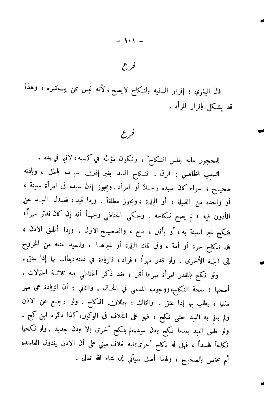 السَّبَبُ الْخَامِسُ: الرِّقُّ. فَنِكَاحُ الْعَبْدِ بِغَيْرِ إِذْنِ سَيِّدِهِ بَاطِلٌ، وَبِإِذْنِهِ صَحِيحٌ، سَوَاءٌ كَانَ سَيِّدُهُ رَجُلًا أَوِ امْرَأَةً. وَيَجُوزُ إِذْنُ سَيِّدِهِ فِي امْرَأَةٍ مُعَيَّنَةٍ، أَوْ وَاحِدَةٍ مِنَ الْقَبِيلَةِ، أَوِ الْبَلْدَةِ، وَيَجُوزُ مُطْلَقًا. وَإِذَا قُيِّدَ، فَعَدَلَ الْعَبْدُ عَنِ الْمَأْذُونِ فِيهِ، لَمْ يَصِحَّ نِكَاحُهُ. وَحَكَى الْحَنَّاطِيُّ وَجْهًا أَنَّهُ إِنْ كَانَ قَدَّرَ مَهْرًا، فَنَكَحَ غَيْرَ الْمُعَيَّنَةِ بِهِ، أَوْ بِأَقَلَّ، صَحَّ، وَالصَّحِيحُ الْأَوَّلُ. وَإِذَا أَطْلَقَ الْإِذْنَ، فَلَهُ نِكَاحُ حُرَّةٍ أَوْ أَمَةٍ، وَفِي تِلْكَ الْبَلْدَةِ أَوْ غَيْرِهَا، وَلِلسَّيِّدِ مَنْعُهُ مِنَ الْخُرُوجِ إِلَى الْبَلْدَةِ الْأُخْرَى. وَلَوْ قَدَّرَ مَهْرًا، فَزَادَ، فَالزِّيَادَةُ فِي ذِمَّتِهِ، يُطْلَبُ بِهَا إِذَا عَتَقَ. وَلَوْ نَكَحَ بِالْمُقَدَّرِ امْرَأَةً مَهْرُهَا أَقَلُّ، فَقَدْ ذَكَرَ الْحَنَّاطِيُّ فِيهِ ثَلَاثَةَ احْتِمَالَاتٍ. أَصَحُّهَا: صِحَّةُ النِّكَاحِ، وَوُجُوبُ الْمُسَمَّى فِي الْحَالِ. وَالثَّانِي: أَنَّ الزِّيَادَةَ عَلَى مَهْرِ مِثْلِهَا، يُطْلَبُ بِهَا إِذَا عَتَقَ. وَالثَّالِثُ: بُطْلَانُ النِّكَاحِ. وَلَوْ رَجَعَ عَنِ الْإِذْنِ وَلَمْ يَعْلَمْ بِهِ الْعَبْدُ حَتَّى نَكَحَ، فَهُوَ عَلَى الْخِلَافِ فِي الْوَكِيلِ، كَذَا ذَكَرَهُ ابْنُ كَجٍّ. وَلَوْ طَلَّقَ الْعَبْدُ بَعْدَمَا نَكَحَ بِإِذْنِ سَيِّدِهِ، لَمْ يَنْكِحْ أُخْرَى إِلَّا بِإِذْنٍ جَدِيدٍ. وَلَوْ نَكَحَهَا نِكَاحًا فَاسِدًا، فَهَلْ لَهُ نِكَاحُ أُخْرَى؟ فِيهِ خِلَافٌ مَبْنِيٌّ عَلَى أَنَّ الْإِذْنَ يَتَنَاوَلُ الْفَاسِدَ، أَمْ يَخْتَصُّ بِالصَّحِيحِ، وَلِهَذَا أَصْلٌ سَيَأْتِي إِنْ شَاءَ اللَّهُ تَعَالَى.