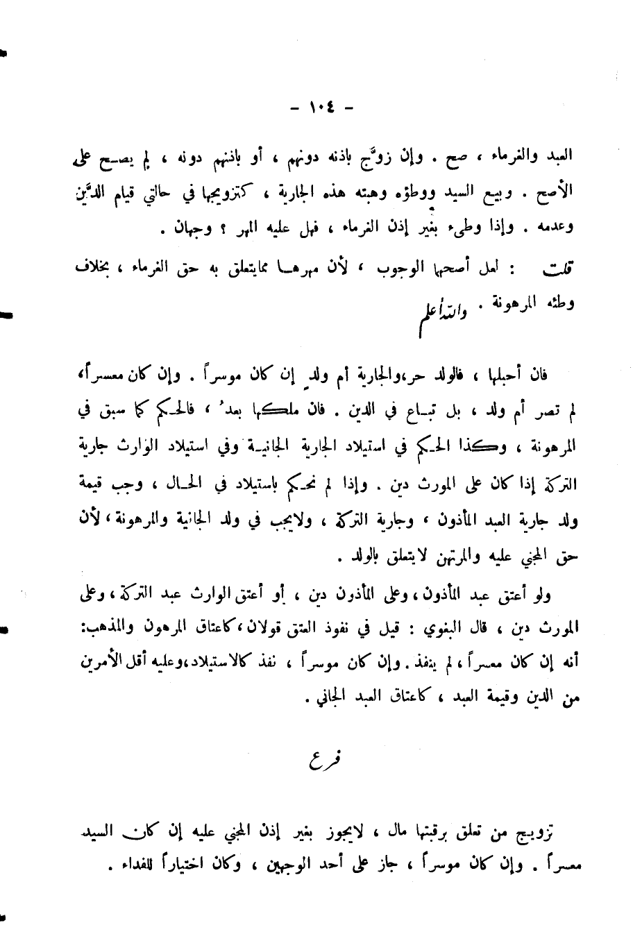 تَزْوِيجُ مَنْ تَعَلَّقَ بِرَقَبَتِهَا مَالٌ، لَا يَجُوزُ بِغَيْرِ إِذْنِ الْمَجْنِيِّ عَلَيْهِ إِنْ كَانَ السَّيِّدُ مُعْسِرًا. وَإِنْ كَانَ مُوسِرًا، جَازَ عَلَى أَحَدِ الْوَجْهَيْنِ، وَكَانَ اخْتِيَارًا لِلْفِدَاءِ.