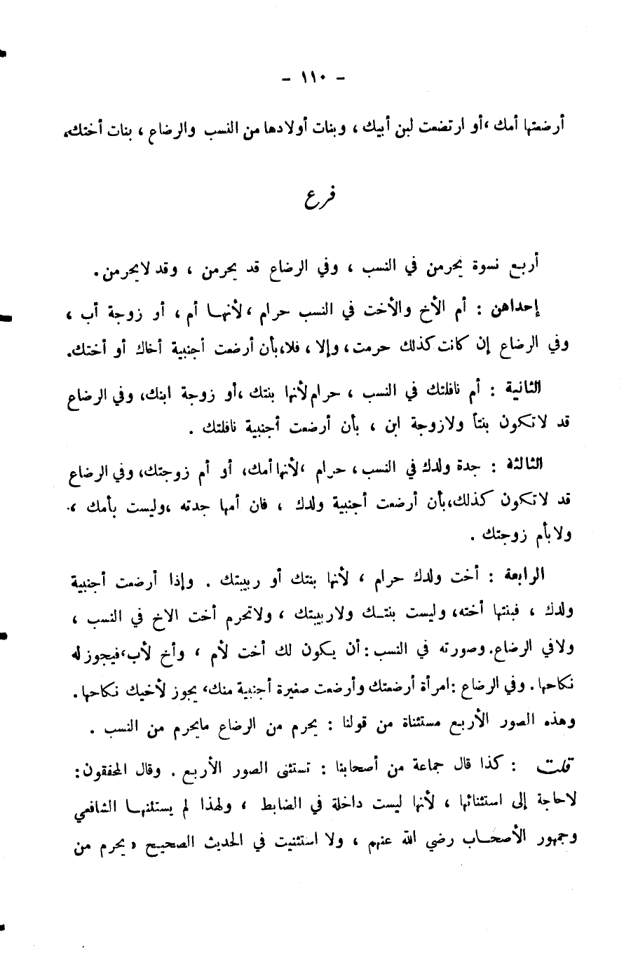 أَرْبَعُ نِسْوَةٍ يَحْرُمْنَ فِي النَّسَبِ، وَفِي الرَّضَاعِ قَدْ يَحْرُمْنَ، وَقَدْ لَا يَحْرُمْنَ. إِحْدَاهُنَّ: أُمُّ الْأَخِ وَالْأُخْتِ فِي النَّسَبِ حَرَامٌ، لِأَنَّهَا أُمٌّ، أَوْ زَوْجَةُ أَبٍ، وَفِي الرَّضَاعِ إِنْ كَانَتْ كَذَلِكَ حَرُمَتْ، وَإِلَّا، فَلَا، بِأَنْ أَرْضَعَتْ أَجْنَبِيَّةٌ أَخَاكَ أَوْ أُخْتَكَ.