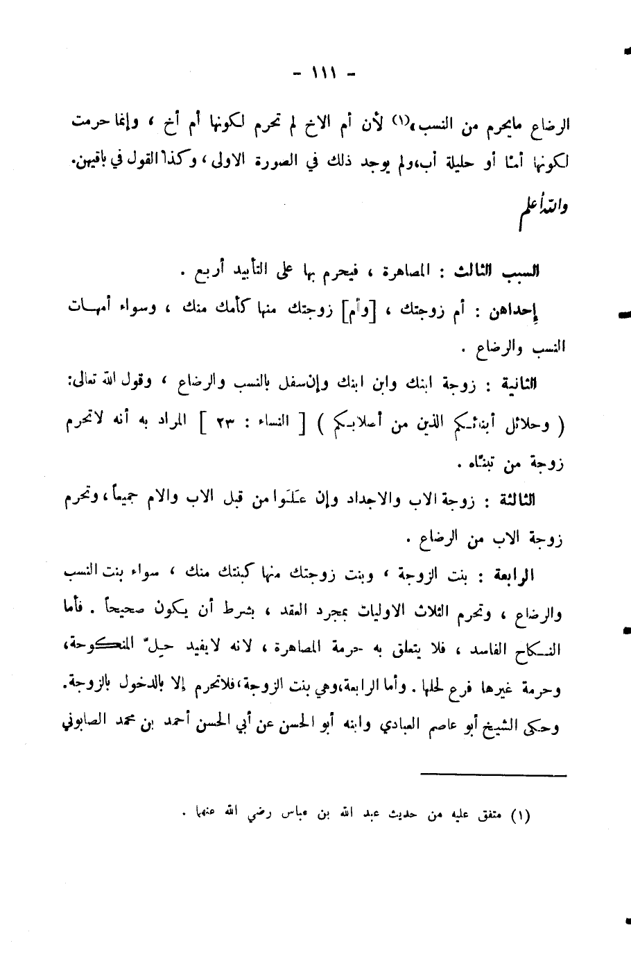 الرَّابِعَةُ: بِنْتُ الزَّوْجَةِ، وَبِنْتُ زَوْجَتِكَ مِنْهَا كَبِنْتِكَ مِنْكَ، سَوَاءٌ بِنْتُ النَّسَبِ وَالرَّضَاعِ، وَتَحْرُمُ الثَّلَاثُ الْأُولَيَاتُ بِمُجَرَّدِ الْعَقْدِ، بِشَرْطِ أَنْ يَكُونَ صَحِيحًا. فَأَمَّا النِّكَاحُ الْفَاسِدُ، فَلَا يَتَعَلَّقُ بِهِ حُرْمَةُ الْمُصَاهَرَةِ، لِأَنَّهُ لَا يُفِيدُ حِلَّ الْمَنْكُوحَةِ، وَحُرْمَةُ غَيْرِهَا فَرْعٌ لِحِلِّهَا. وَأَمَّا الرَّابِعَةُ، وَهِيَ بِنْتُ الزَّوْجَةِ، فَلَا تَحْرُمُ إِلَّا بِالدُّخُولِ بِالزَّوْجَةِ. وَحَكَى الشَّيْخُ أَبُو عَاصِمٍ الْعَبَّادِيُّ وَابْنُهُ أَبُو الْحَسَنِ عَنْ أَبِي الْحَسَنِ أَحْمَدَ بْنِ مُحَمَّدٍ الصَّابُونِيِّ