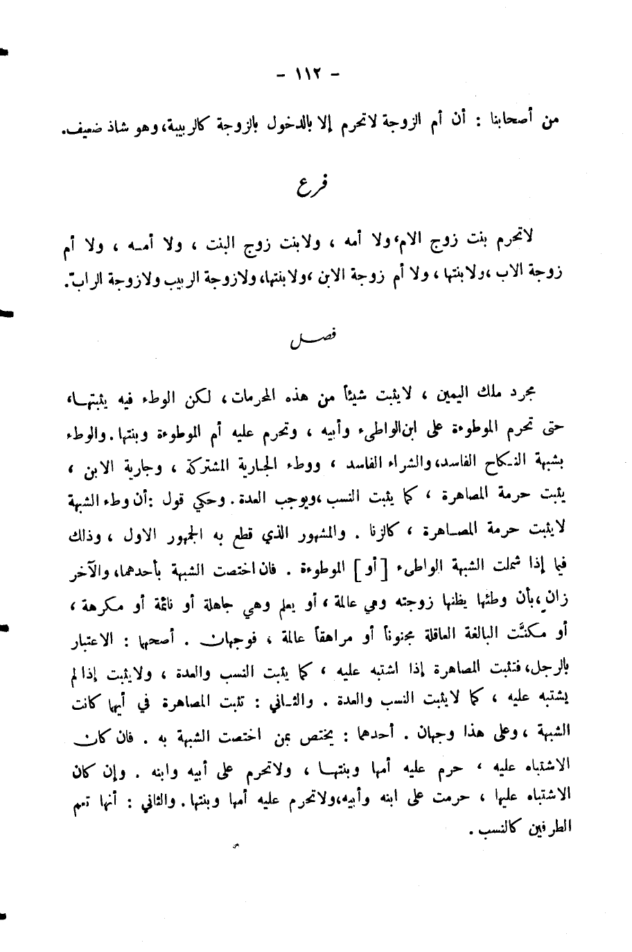 مُجَرَّدُ مِلْكِ الْيَمِينِ، لَا يُثْبِتُ شَيْئًا مِنْ هَذِهِ الْمُحَرَّمَاتِ، لَكِنَّ الْوَطْءَ فِيهِ يُثْبِتُهَا، حَتَّى تَحْرُمَ الْمَوْطُوءَةُ عَلَى ابْنِ الْوَاطِئِ وَأَبِيهِ، وَتَحْرُمَ عَلَيْهِ أُمُّ الْمَوْطُوءَةِ وَبِنْتُهَا. وَالْوَطْءُ بِشُبْهَةِ النِّكَاحِ الْفَاسِدِ، وَالشِّرَاءِ الْفَاسِدِ، وَوَطْءُ الْجَارِيَةِ الْمُشْتَرَكَةِ، وَجَارِيَةِ الِابْنِ، يُثْبِتُ حُرْمَةَ الْمُصَاهَرَةِ، كَمَا يُثْبِتُ النَّسَبَ، وَيُوجِبُ الْعِدَّةَ. وَحُكِيَ قَوْلٌ: أَنَّ وَطْءَ الشُّبْهَةِ لَا يُثْبِتُ حُرْمَةَ الْمُصَاهَرَةِ، كَالزِّنَا. وَالْمَشْهُورُ الَّذِي قَطَعَ بِهِ الْجُمْهُورُ الْأَوَّلُ، وَذَلِكَ فِيمَا إِذَا شَمِلَتِ الشُّبْهَةُ الْوَاطِئَ (أَوِ) الْمَوْطُوءَةَ. فَإِنِ اخْتَصَّتِ الشُّبْهَةُ بِأَحَدِهِمَا، وَالْآخَرُ زَانٍ، بِأَنْ وَطِئَهَا يَظُنُّهَا زَوْجَتَهُ وَهِيَ عَالِمَةٌ، أَوْ يَعْلَمُ وَهِيَ جَاهِلَةٌ أَوْ نَائِمَةٌ أَوْ مُكْرَهَةٌ، أَوْ مَكَّنَتِ الْبَالِغَةُ الْعَاقِلَةُ مَجْنُونًا أَوْ مُرَاهِقًا عَالِمَةً، فَوَجْهَانِ. أَصَحُّهُمَا: الِاعْتِبَارُ بِالرَّجُلِ، فَتَثْبُتُ الْمُصَاهَرَةُ إِذَا اشْتَبَهَ عَلَيْهِ، كَمَا يَثْبُتُ النَّسَبُ وَالْعِدَّةُ، وَلَا يَثْبُتُ إِذَا لَمْ يَشْتَبِهْ عَلَيْهِ، كَمَا لَا يَثْبُتُ النَّسَبُ وَالْعِدَّةُ. وَالثَّانِي: تَثْبُتُ الْمُصَاهَرَةُ فِي أَيِّهِمَا كَانَتِ الشُّبْهَةُ، وَعَلَى هَذَا وَجْهَانِ. أَحَدُهُمَا: يَخْتَصُّ بِمَنِ اخْتَصَّتِ الشُّبْهَةُ بِهِ. فَإِنْ كَانَ الِاشْتِبَاهُ عَلَيْهِ، حَرُمَ عَلَيْهِ أُمُّهَا وَبِنْتُهَا، وَلَا تَحْرُمُ عَلَى أَبِيهِ وَابْنِهِ. وَإِنْ كَانَ الِاشْتِبَاهُ عَلَيْهَا، حَرُمَتْ عَلَى ابْنِهِ وَأَبِيهِ، وَلَا تَحْرُمُ عَلَيْهِ أُمُّهَا وَبِنْتُهَا. وَالثَّانِي: أَنَّهَا تَعُمُّ الطَّرَفَيْنِ كَالنَّسَبِ.