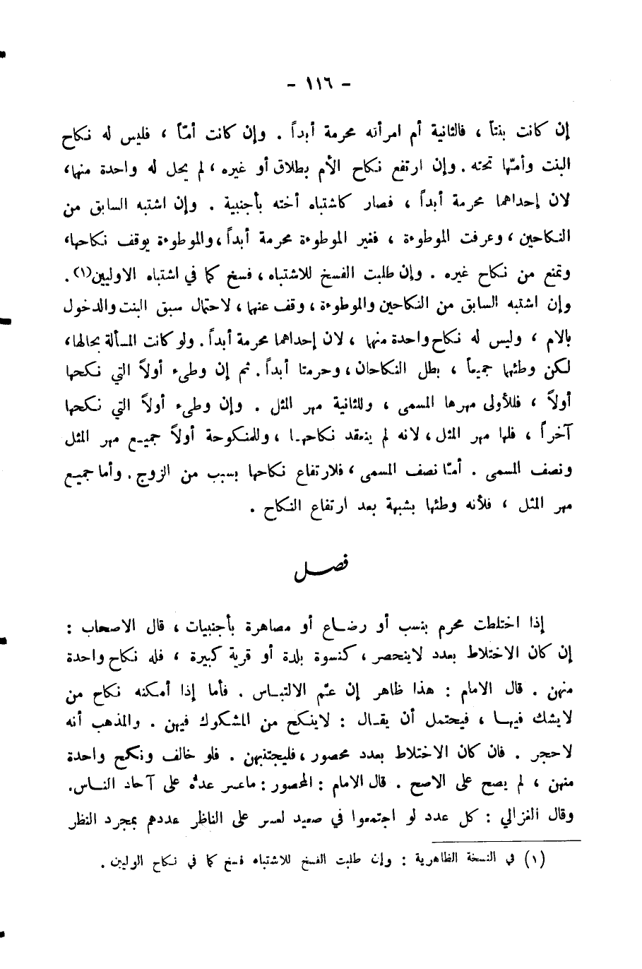 إِنْ كَانَتْ بِنْتًا، فَالثَّانِيَةُ أُمُّ امْرَأَتِهِ مُحَرَّمَةٌ أَبَدًا. وَإِنْ كَانَتْ أُمًّا، فَلَيْسَ لَهُ نِكَاحُ الْبِنْتِ وَأُمُّهَا تَحْتَهُ. وَإِنِ ارْتَفَعَ نِكَاحُ الْأُمِّ بِطَلَاقٍ أَوْ غَيْرِهِ، لَمْ يَحِلَّ لَهُ وَاحِدَةٌ مِنْهُمَا، لِأَنَّ إِحْدَاهُمَا مُحَرَّمَةٌ أَبَدًا، فَصَارَ كَاشْتِبَاهِ أُخْتِهِ بِأَجْنَبِيَّةٍ. وَإِنِ اشْتَبَهَ السَّابِقُ مِنَ النِّكَاحَيْنِ، وَعُرِفَتِ الْمَوْطُوءَةُ، فَغَيْرُ الْمَوْطُوءَةِ مُحَرَّمَةٌ أَبَدًا، وَالْمَوْطُوءَةُ يُوقَفُ نِكَاحُهَا، وَتُمْنَعُ مِنْ نِكَاحِ غَيْرِهِ. وَإِنْ طَلَبَتِ الْفَسْخَ لِلِاشْتِبَاهِ، فُسِخَ كَمَا فِي اشْتِبَاهِ الْأُولَيَيْنِ. وَإِنِ اشْتَبَهَ السَّابِقُ مِنَ النِّكَاحَيْنِ وَالْمَوْطُوءَةِ، وُقِفَ عَنْهُمَا، لِاحْتِمَالِ سَبْقِ الْبِنْتِ وَالدُّخُولِ بِالْأُمِّ، وَلَيْسَ لَهُ نِكَاحُ وَاحِدَةٍ مِنْهُمَا، لِأَنَّ إِحْدَاهُمَا مُحَرَّمَةٌ أَبَدًا. وَلَوْ كَانَتِ الْمَسْأَلَةُ بِحَالِهَا، لَكِنْ وَطِئَهُمَا جَمِيعًا، بَطَلَ النِّكَاحَانِ، وَحَرُمَتَا أَبَدًا. ثُمَّ إِنْ وَطِئَ أَوَّلًا الَّتِي نَكَحَهَا أَوَّلًا، فَلِلْأُولَى مَهْرُهَا الْمُسَمَّى، وَلِلثَّانِيَةِ مَهْرُ الْمِثْلِ. وَإِنْ وَطِئَ أَوَّلًا الَّتِي نَكَحَهَا آخِرًا، فَلَهَا مَهْرُ الْمِثْلِ، لِأَنَّهُ لَمْ يَنْعَقِدْ نِكَاحُهَا، وَلِلْمَنْكُوحَةِ أَوَّلًا جَمِيعُ مَهْرِ) الْمِثْلِ وَنِصْفُ الْمُسَمَّى.