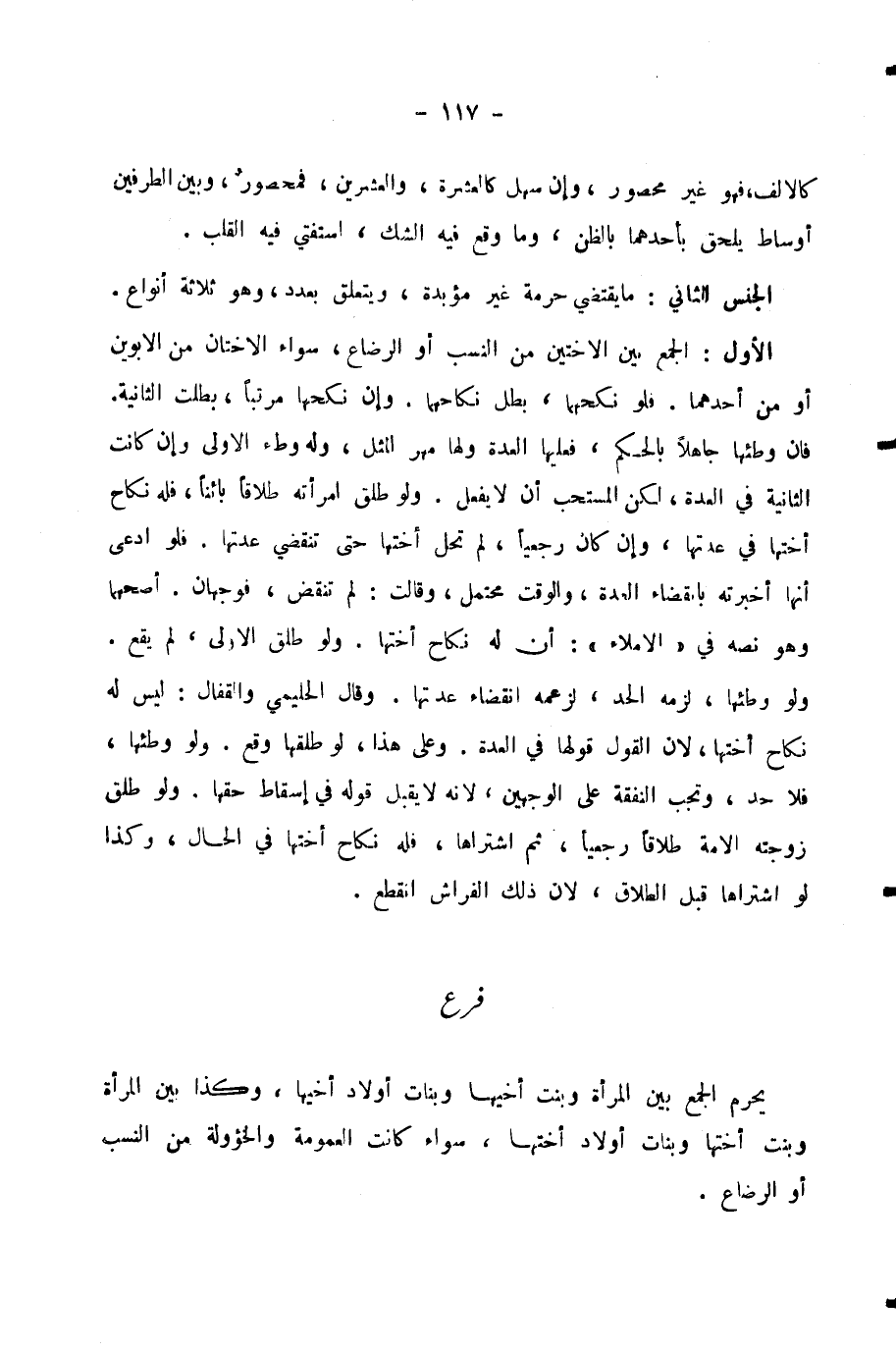 يَحْرُمُ الْجَمْعُ بَيْنَ الْمَرْأَةِ وَبِنْتِ أَخِيهَا وَبَنَاتِ أَوْلَادِ أَخِيهَا، وَكَذَا بَيْنَ الْمَرْأَةِ وَبِنْتِ أُخْتِهَا وَبَنَاتِ أَوْلَادِ أُخْتِهَا، سَوَاءٌ كَانَتِ الْعُمُومَةُ وَالْخُؤُولَةُ مِنَ النَّسَبِ