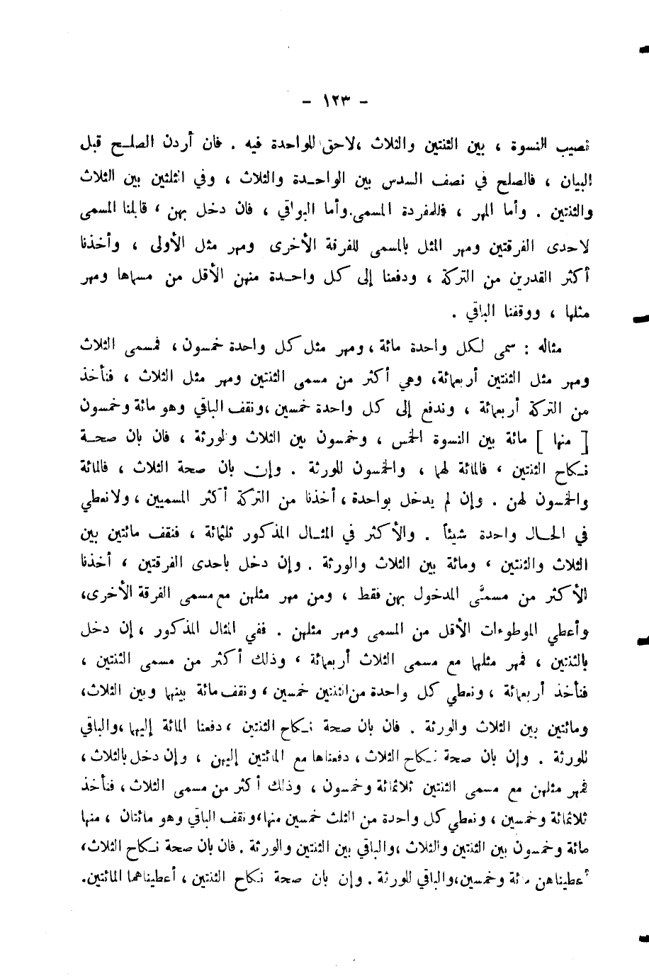 مِثَالُهُ: سَمَّى لِكُلِّ وَاحِدَةٍ مِائَةً، وَمَهْرُ مِثْلِ كُلِّ وَاحِدَةٍ خَمْسُونَ، فَمُسَمَّى الثَّلَاثِ وَمَهْرُ مِثْلِ الثِّنْتَيْنِ أَرْبَعُمِائَةٍ، وَهِيَ أَكْثَرُ مِنْ مُسَمَّى الثِّنْتَيْنِ وَمَهْرِ مِثْلِ الثَّلَاثِ، فَنَأْخُذُ مِنَ التَّرِكَةِ أَرْبَعَمِائَةٍ، وَنَدْفَعُ إِلَى كُلِّ وَاحِدَةٍ خَمْسِينَ، وَنَقِفُ الْبَاقِيَ وَهُوَ مِائَةٌ وَخَمْسُونَ (مِنْهَا) مِائَةٌ بَيْنَ النِّسْوَةِ الْخَمْسِ، وَخَمْسُونَ بَيْنَ الثَّلَاثِ وَالْوَرَثَةِ، فَإِنْ بَانَ صِحَّةُ نِكَاحِ الثِّنْتَيْنِ، فَالْمِائَةُ لَهُمَا، وَالْخَمْسُونَ لِلْوَرَثَةِ. وَإِنْ بَانَ صِحَّةُ الثَّلَاثِ، فَالْمِائَةُ وَالْخَمْسُونَ لَهُنَّ. وَإِنْ لَمْ يَدْخُلْ بِوَاحِدَةٍ، أَخَذْنَا مِنَ التَّرِكَةِ أَكْثَرَ الْمُسَمَّيَيْنِ، وَلَا نُعْطِي فِي الْحَالِ وَاحِدَةً شَيْئًا. وَالْأَكْثَرُ فِي الْمِثَالِ الْمَذْكُورِ ثَلَاثُمِائَةٍ، فَنَقِفُ مِائَتَيْنِ بَيْنَ الثَّلَاثِ وَالثِّنْتَيْنِ، وَمِائَةً بَيْنَ الثَّلَاثِ وَالْوَرَثَةِ. وَإِنْ دَخَلَ بِإِحْدَى الْفِرْقَتَيْنِ، أَخَذْنَا الْأَكْثَرَ مِنْ مُسَمَّى الْمَدْخُولِ بِهِنَّ فَقَطْ، وَمِنْ مَهْرِ مِثْلِهِنَّ مَعَ مُسَمَّى الْفِرْقَةِ الْأُخْرَى، وَأُعْطِيَ الْمَوْطُوءَاتُ الْأَقَلَّ مِنَ الْمُسَمَّى وَمَهْرِ مِثْلِهِنَّ. فَفِي الْمِثَالِ الْمَذْكُورِ، إِنْ دَخَلَ بِالثِّنْتَيْنِ، فَمَهْرُ مِثْلِهِمَا مَعَ مُسَمَّى الثَّلَاثِ أَرْبَعُمِائَةٍ، وَذَلِكَ أَكْثَرُ مِنْ مُسَمَّى الثِّنْتَيْنِ، فَنَأْخُذُ أَرْبَعَمِائَةٍ، وَنُعْطِي كُلَّ وَاحِدَةٍ مِنَ الثِّنْتَيْنِ خَمْسِينَ، وَنَقِفُ مِائَةً بَيْنَهُمَا وَبَيْنَ الثَّلَاثِ، وَمِائَتَيْنِ بَيْنَ الثَّلَاثِ وَالْوَرَثَةِ. فَإِنْ بَانَ صِحَّةُ نِكَاحِ الثِّنْتَيْنِ، دَفَعْنَا الْمِائَةَ إِلَيْهِمَا، وَالْبَاقِي لِلْوَرَثَةِ. وَإِنْ بَانَ صِحَّةُ نِكَاحِ الثَّلَاثِ، دَفَعْنَاهَا مَعَ الْمِائَتَيْنِ إِلَيْهِنَّ، وَإِنْ دَخَلَ بِالثَّلَاثِ، فَمَهْرُ مِثْلِهِنَّ مَعَ مُسَمَّى الثِّنْتَيْنِ ثَلَاثُمِائَةٍ وَخَمْسُونَ، وَذَلِكَ أَكْثَرُ مِنْ مُسَمَّى الثَّلَاثِ، فَنَأْخُذُ ثَلَاثَمِائَةٍ وَخَمْسِينَ، وَنُعْطِي كُلَّ وَاحِدَةٍ مِنَ الثُّلُثِ خَمْسِينَ مِنْهَا، وَنَقِفُ الْبَاقِيَ وَهُوَ مِائَتَانِ، مِنْهَا مِائَةٌ وَخَمْسُونَ بَيْنَ الثِّنْتَيْنِ وَالثَّلَاثِ، وَالْبَاقِي بَيْنَ الثِّنْتَيْنِ وَالْوَرَثَةِ. فَإِنْ بَانَ صِحَّةُ نِكَاحِ الثَّلَاثِ، أَعْطَيْنَاهُنَّ مِائَةً وَخَمْسِينَ، وَالْبَاقِي لِلْوَرَثَةِ. وَإِنْ بَانَ صِحَّةُ نِكَاحِ الثِّنْتَيْنِ، أَعْطَيْنَاهُمَا الْمِائَتَيْنِ.