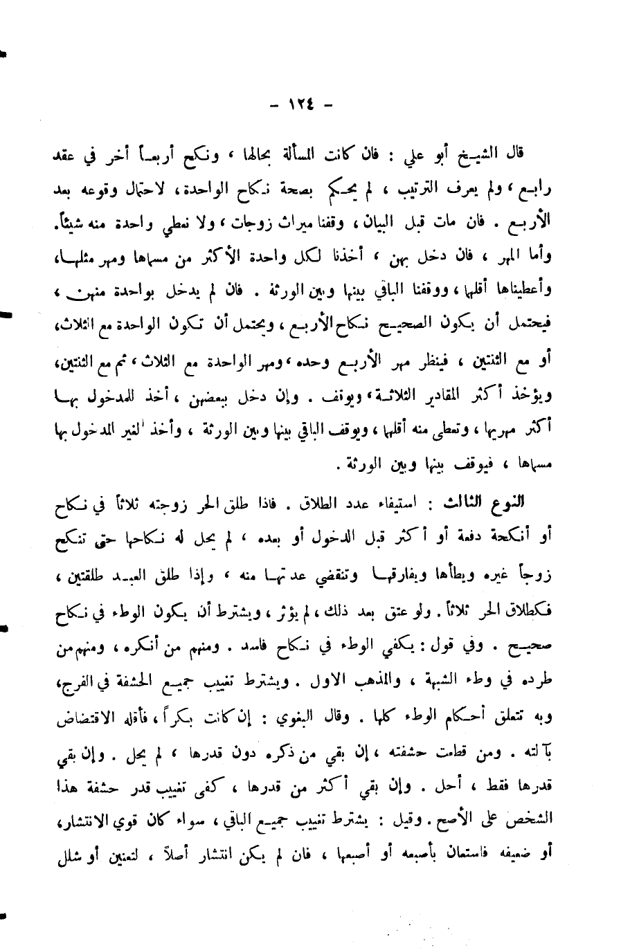 قَالَ الشَّيْخُ أَبُو عَلِيٍّ: فَإِنْ كَانَتِ الْمَسْأَلَةُ بِحَالِهَا، وَنَكَحَ أَرْبَعًا أُخَرَ فِي عَقْدٍ رَابِعٍ، وَلَمْ يُعْرَفِ التَّرْتِيبُ، لَمْ يُحْكَمْ بِصِحَّةِ نِكَاحِ الْوَاحِدَةِ، لِاحْتِمَالِ وُقُوعِهِ بَعْدَ الْأَرْبَعِ. فَإِنْ مَاتَ قَبْلَ الْبَيَانِ، وَقَفْنَا مِيرَاثَ زَوْجَاتٍ، وَلَا نُعْطِي وَاحِدَةً مِنْهُ شَيْئًا. وَأَمَّا الْمَهْرُ، فَإِنْ دَخَلَ بِهِنَّ، أَخَذْنَا لِكُلِّ وَاحِدَةٍ الْأَكْثَرَ مِنْ مُسَمَّاهَا وَمَهْرِ مِثْلِهَا، وَأَعْطَيْنَاهَا أَقَلَّهُمَا، وَوَقَفْنَا الْبَاقِيَ بَيْنَهَا وَبَيْنَ الْوَرَثَةِ. فَإِنْ لَمْ يَدْخُلْ بِوَاحِدَةٍ مِنْهُنَّ، فَيُحْتَمَلُ أَنْ يَكُونَ الصَّحِيحُ نِكَاحَ الْأَرْبَعِ، وَيُحْتَمَلُ أَنْ تَكُونَ الْوَاحِدَةُ مَعَ الثَّلَاثِ، أَوْ مَعَ الثِّنْتَيْنِ، فَيُنْظَرُ مَهْرُ الْأَرْبَعِ وَحْدَهُ، وَمَهْرُ الْوَاحِدَةِ مَعَ الثَّلَاثِ، ثُمَّ مَعَ الثِّنْتَيْنِ، وَيُؤْخَذُ أَكْثَرُ الْمَقَادِيرِ الثَّلَاثَةِ، وَيُوقَفُ. وَإِنْ دَخَلَ بِبَعْضِهِنَّ، أُخِذَ لِلْمَدْخُولِ بِهَا أَكْثَرُ مَهْرَيْهَا، وَتُعْطَى مِنْهُ أَقَلَّهُمَا، وَيُوقَفُ الْبَاقِي بَيْنَهَا وَبَيْنَ الْوَرَثَةِ، وَأُخِذَ لِغَيْرِ الْمَدْخُولِ بِهَا مُسَمَّاهَا، فَيُوقَفُ بَيْنَهَا وَبَيْنَ الْوَرَثَةِ.
