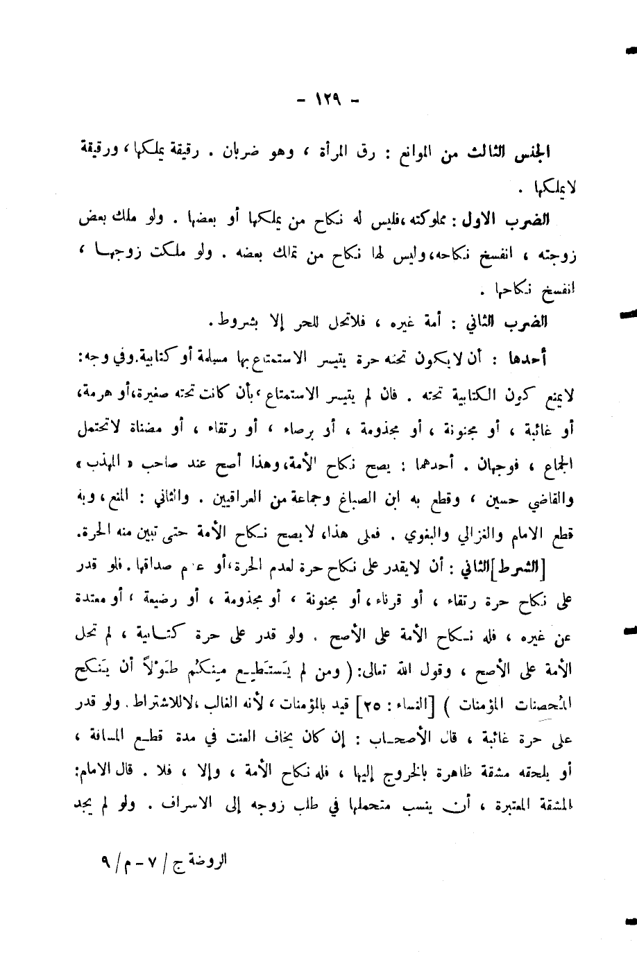 الْجِنْسُ الثَّالِثُ مِنَ الْمَوَانِعِ: رِقُّ الْمَرْأَةِ، وَهُوَ ضَرْبَانِ. رَقِيقَةٌ يَمْلِكُهَا، وَرَقِيقَةٌ لَا يَمْلِكُهَا. الضَّرْبُ الْأَوَّلُ: مَمْلُوكَتُهُ، فَلَيْسَ لَهُ نِكَاحُ مَنْ يَمْلِكُهَا أَوْ بَعْضَهَا. وَلَوْ مَلَكَ بَعْضَ زَوْجَتِهِ، انْفَسَخَ نِكَاحُهُ، وَلَيْسَ لَهَا نِكَاحُ مَنْ تَمْلِكُ بَعْضَهُ. وَلَوْ مَلَكَتْ زَوْجَهَا، انْفَسَخَ نِكَاحُهَا.