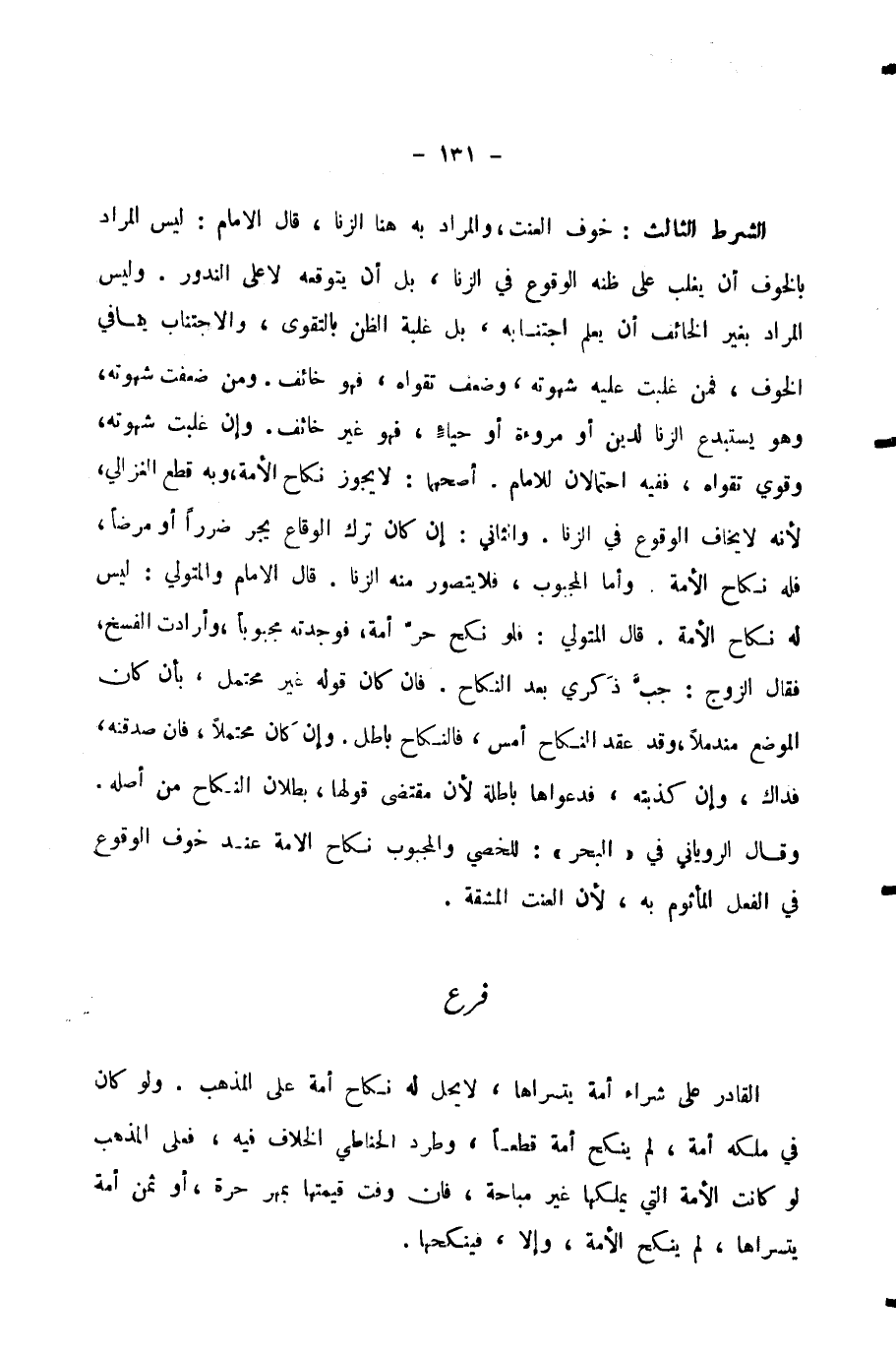 الشَّرْطُ الثَّالِثُ: خَوْفُ الْعَنَتِ، وَالْمُرَادُ بِهِ هُنَا الزِّنَا، قَالَ الْإِمَامُ: لَيْسَ الْمُرَادُ بِالْخَوْفِ أَنْ يَغْلِبَ عَلَى ظَنِّهِ الْوُقُوعُ فِي الزِّنَا، بَلْ أَنْ يَتَوَقَّعَهُ لَا عَلَى النُّدُورِ. وَلَيْسَ الْمُرَادُ بِغَيْرِ الْخَائِفِ أَنْ يُعْلَمَ اجْتِنَابُهُ، بَلْ غَلَبَةُ الظَّنِّ بِالتَّقْوَى، وَالِاجْتِنَابُ يُنَافِي الْخَوْفَ، فَمَنْ غَلَبَتْ عَلَيْهِ شَهْوَتُهُ، وَضَعْفُ تَقْوَاهُ، فَهُوَ خَائِفٌ. وَمَنْ ضَعُفَتْ شَهْوَتُهُ، وَهُوَ يَسْتَبْدِعُ الزِّنَا لِدِينٍ أَوْ مُرُوءَةٍ أَوْ حَيَاءٍ، فَهُوَ غَيْرُ خَائِفٍ. وَإِنْ غَلَبَتْ شَهْوَتُهُ، وَقَوِيَ تَقْوَاهُ، فَفِيهِ احْتِمَالَانِ لِلْإِمَامِ. أَصَحُّهُمَا: لَا يَجُوزُ نِكَاحُ الْأَمَةِ، وَبِهِ قَطَعَ الْغَزَالِيُّ، لِأَنَّهُ لَا يَخَافُ الْوُقُوعَ فِي الزِّنَا. وَالثَّانِي: إِنْ كَانَ تَرْكُ الْوِقَاعِ يَجُرُّ ضَرَرًا أَوْ مَرَضًا، فَلَهُ نِكَاحُ الْأَمَةِ. وَأَمَّا الْمَجْبُوبُ، فَلَا يُتَصَوَّرُ مِنْهُ الزِّنَا. قَالَ الْإِمَامُ وَالْمُتَوَلِّي: لَيْسَ لَهُ نِكَاحُ الْأَمَةِ. قَالَ الْمُتَوَلِّي: فَلَوْ نَكَحَ حُرٌّ أَمَةً، فَوَجَدَتْهُ مَجْبُوبًا، وَأَرَادَتِ الْفَسْخَ، فَقَالَ الزَّوْجُ: جُبَّ ذَكَرِي بَعْدَ النِّكَاحِ. فَإِنْ كَانَ قَوْلُهُ غَيْرَ مُحْتَمَلٍ، بِأَنْ كَانَ الْمَوْضِعُ مُنْدَمِلًا، وَقَدْ عُقِدَ النِّكَاحُ أَمْسِ، فَالنِّكَاحُ بَاطِلٌ. وَإِنْ كَانَ مُحْتَمَلًا، فَإِنْ صَدَّقَتْهُ، فَذَاكَ، وَإِنْ كَذَّبَتْهُ، فَدَعْوَاهَا بَاطِلَةٌ لِأَنَّ مُقْتَضَى قَوْلِهَا، بُطْلَانُ النِّكَاحِ مِنْ أَصْلِهِ. وَقَالَ الرُّويَانِيُّ فِي الْبَحْرِ: لِلْخَصِيِّ وَالْمَجْبُوبِ نِكَاحُ الْأَمَةِ عِنْدَ خَوْفِ الْوُقُوعِ فِي الْفِعْلِ الْمَأْثُومِ بِهِ، لِأَنَّ الْعَنَتَ الْمَشَقَّةُ.