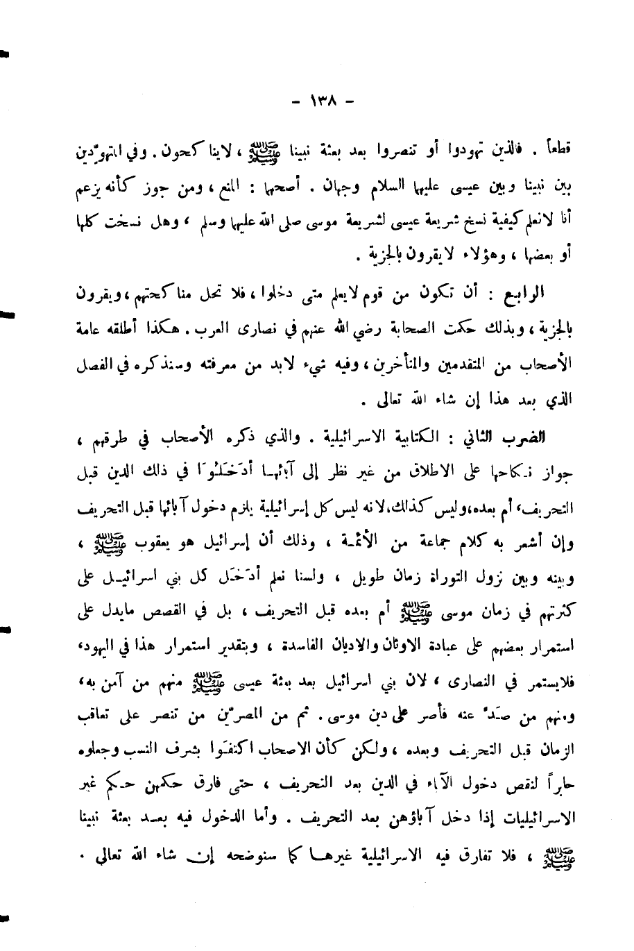 الرَّابِعُ: أَنْ تَكُونَ مِنْ قَوْمٍ لَا يُعْلَمُ مَتَى دَخَلُوا، فَلَا تَحِلُّ مُنَاكَحَتُهُمْ، وَيُقَرُّونَ بِالْجِزْيَةِ، وَبِذَلِكَ حَكَمَتِ الصَّحَابَةُ - رَضِيَ اللَّهُ عَنْهُمْ - فِي نَصَارَى الْعَرَبِ. هَكَذَا أَطْلَقَهُ عَامَّةُ الْأَصْحَابِ مِنَ الْمُتَقَدِّمِينَ وَالْمُتَأَخِّرِينَ، وَفِيهِ شَيْءٌ لَا بُدَّ مِنْ مَعْرِفَتِهِ وَسَنَذْكُرُهُ فِي الْفَصْلِ الَّذِي بَعْدَ هَذَا إِنْ شَاءَ اللَّهُ تَعَالَى.