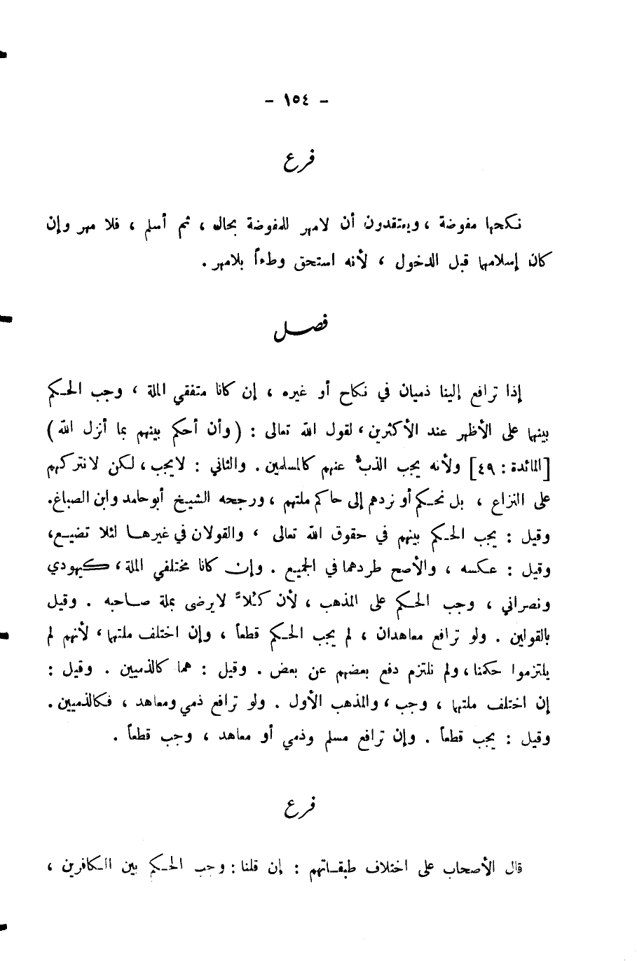 إِذَا تَرَافَعَ إِلَيْنَا ذِمِّيَّانِ فِي نِكَاحٍ أَوْ غَيْرِهِ، إِنْ كَانَا مُتَّفِقَيِ الْمِلَّةِ، وَجَبَ الْحُكْمُ بَيْنَهُمَا عَلَى الْأَظْهَرِ عِنْدَ الْأَكْثَرِينَ، لِقَوْلِ اللَّهِ تَعَالَى: (وَأَنِ احْكُمْ بَيْنَهُمْ بِمَا أَنْزَلَ اللَّهُ) [الْمَائِدَةِ: 49] وَلِأَنَّهُ يَجِبُ الذَّبُّ عَنْهُمْ كَالْمُسْلِمِينَ. وَالثَّانِي: لَا يَجِبُ، لَكِنْ لَا نَتْرُكُهُمْ عَلَى النِّزَاعِ، بَلْ نَحْكُمُ أَوْ نَرُدُّهُمْ إِلَى حَاكِمِ مِلَّتِهِمْ، وَرَجَّحَهُ الشَّيْخُ أَبُو حَامِدٍ وَابْنُ الصَّبَّاغِ. وَقِيلَ: يَجِبُ الْحُكْمُ بَيْنَهُمْ فِي حُقُوقِ اللَّهِ تَعَالَى، وَالْقَوْلَانِ فِي غَيْرِهَا لِئَلَّا تَضِيعَ، وَقِيلَ: عَكْسُهُ، وَالْأَصَحُّ طَرْدُهُمَا فِي الْجَمِيعِ. وَإِنْ كَانَا مُخْتَلِفَيِ الْمِلَّةِ، كَيَهُودِيٍّ وَنَصْرَانِيٍّ، وَجَبَ الْحُكْمُ عَلَى الْمَذْهَبِ، لِأَنَّ كُلًّا لَا يَرْضَى بِمِلَّةِ صَاحِبِهِ. وَقِيلَ بِالْقَوْلَيْنِ. وَلَوْ تَرَافَعَ مُعَاهَدَانِ، لَمْ يَجِبِ الْحُكْمُ قَطْعًا، وَإِنِ اخْتَلَفَ مِلَّتُهُمَا، لِأَنَّهُمْ لَمْ يَلْتَزِمُوا حُكْمَنَا، وَلَمْ نَلْتَزِمْ دَفْعَ بَعْضِهِمْ عَنْ بَعْضٍ. وَقِيلَ: هُمَا كَالذِّمِّيِّينَ. وَقِيلَ: إِنِ اخْتَلَفَ مِلَّتُهُمَا، وَجَبَ، وَالْمَذْهَبُ الْأَوَّلُ. وَلَوْ تَرَافَعَ ذِمِّيٌّ وَمُعَاهَدٌ، فَكَالذِّمِّيِّينَ. وَقِيلَ: يَجِبُ قَطْعًا. وَإِنْ تَرَافَعَ مُسْلِمٌ وَذِمِّيٌّ أَوْ مُعَاهَدٌ، وَجَبَ قَطْعًا.