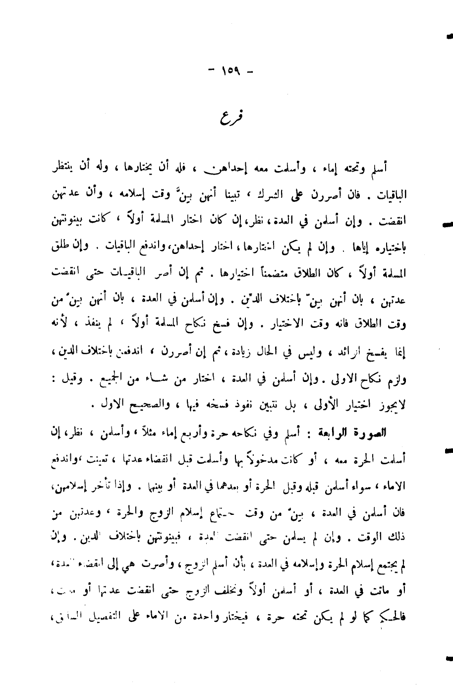 الرَّابِعَةُ: أَسْلَمَ وَفِي نِكَاحِهِ حُرَّةٌ وَأَرْبَعُ إِمَاءٍ مَثَلًا، وَأَسْلَمْنَ، نُظِرَ، إِنْ أَسْلَمَتِ الْحُرَّةُ مَعَهُ، أَوْ كَانَتْ مَدْخُولًا بِهَا وَأَسْلَمَتْ قَبْلَ انْقِضَاءِ عِدَّتِهَا، تَعَيَّنَتْ، وَانْدَفَعَ الْإِمَاءُ، سَوَاءٌ أَسْلَمْنَ قَبْلَهُ وَقَبْلَ الْحُرَّةِ أَوْ بَعْدَهُمَا فِي الْعِدَّةِ أَوْ بَيْنَهُمَا. وَإِذَا تَأَخَّرَ إِسْلَامُهُنَّ، فَإِنْ أَسْلَمْنَ فِي الْعِدَّةِ، بِنَّ مِنْ وَقْتِ اجْتِمَاعِ إِسْلَامِ الزَّوْجِ وَالْحُرَّةِ، وَعِدَّتُهُنَّ مِنْ ذَلِكَ الْوَقْتِ. وَإِنْ لَمْ يُسْلِمْنَ حَتَّى انْقَضَتِ الْعِدَّةُ، فَبَيْنُونَتُهُنَّ بِاخْتِلَافِ الدِّينِ. وَإِنْ لَمْ يَجْتَمِعْ إِسْلَامُ الْحُرَّةِ وَإِسْلَامُهُ فِي الْعِدَّةِ، بِأَنْ أَسْلَمَ الزَّوْجُ، وَأَصَرَّتْ هِيَ إِلَى انْقِضَاءِ الْعِدَّةِ، أَوْ مَاتَتْ فِي الْعِدَّةِ، أَوْ أَسْلَمْنَ أَوَّلًا وَتَخَلَّفَ الزَّوْجُ حَتَّى انْقَضَتْ عِدَّتُهَا أَوْ مَاتَتْ، فَالْحُكْمُ كَمَا لَوْ لَمْ يَكُنْ تَحْتَهُ حُرَّةٌ، فَيَخْتَارُ وَاحِدَةً مِنَ الْإِمَاءِ عَلَى التَّفْصِيلِ السَّابِقِ،