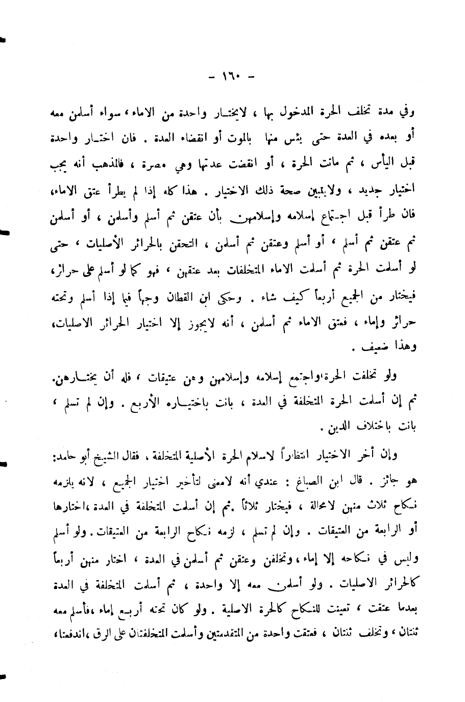 وَإِنْ أَخَّرَ الِاخْتِيَارَ انْتِظَارًا لِإِسْلَامِ الْحُرَّةِ الْأَصْلِيَّةِ الْمُتَخَلِّفَةِ، فَقَالَ الشَّيْخُ أَبُو حَامِدٍ: هُوَ جَائِزٌ. قَالَ ابْنُ الصَّبَّاغِ: عِنْدِي أَنَّهُ لَا مَعْنَى لِتَأْخِيرِ اخْتِيَارِ الْجَمِيعِ، لِأَنَّهُ يَلْزَمُهُ نِكَاحُ ثَلَاثٍ مِنْهُنَّ لَا مَحَالَةَ، فَيَخْتَارُ ثَلَاثًا. ثُمَّ إِنْ أَسْلَمَتِ الْمُتَخَلِّفَةُ فِي الْعِدَّةِ، اخْتَارَهَا أَوِ الرَّابِعَةَ مِنَ الْعَتِيقَاتِ. وَإِنْ لَمْ تُسْلِمْ، لَزِمَهُ نِكَاحُ الرَّابِعَةِ مِنَ الْعَتِيقَاتِ. وَلَوْ أَسْلَمَ وَلَيْسَ فِي نِكَاحِهِ إِلَّا إِمَاءٌ، وَتَخَلَّفْنَ وَعَتَقْنَ ثُمَّ أَسْلَمْنَ فِي الْعِدَّةِ، اخْتَارَ مِنْهُنَّ أَرْبَعًا كَالْحَرَائِرِ الْأَصْلِيَّاتِ. وَلَوْ أَسْلَمْنَ مَعَهُ إِلَّا وَاحِدَةً، ثُمَّ أَسْلَمَتِ الْمُتَخَلِّفَةُ فِي الْعِدَّةِ بَعْدَمَا عَتَقَتْ، تَعَيَّنَتْ لِلنِّكَاحِ كَالْحُرَّةِ الْأَصْلِيَّةِ. وَلَوْ كَانَ تَحْتَهُ أَرْبَعُ إِمَاءٍ، فَأَسْلَمَ مَعَهُ ثِنْتَانِ، وَتَخَلَّفَ ثِنْتَانِ، فَعَتَقَتْ وَاحِدَةٌ مِنَ الْمُتَقَدِّمَتَيْنِ وَأَسْلَمَتِ الْمُتَخَلِّفَتَانِ عَلَى الرِّقِّ، انْدَفَعَتَا