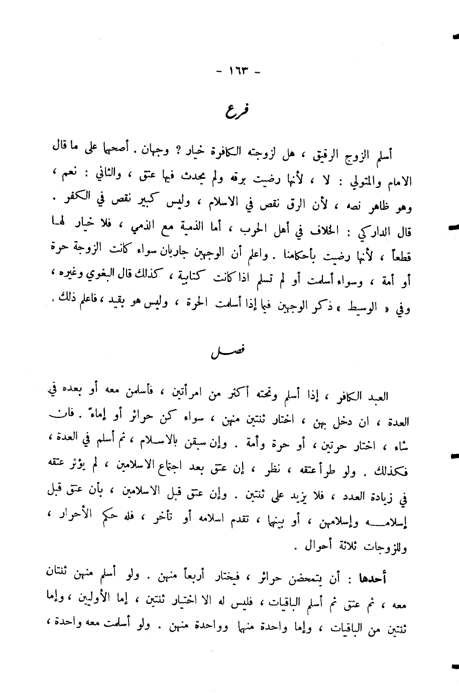أَسْلَمَ الزَّوْجُ الرَّقِيقُ، هَلْ لِزَوْجَتِهِ الْكَافِرَةِ خِيَارٌ؟ وَجْهَانِ. أَصَحُّهُمَا عَلَى مَا قَالَ الْإِمَامُ وَالْمُتَوَلِّي: لَا، لِأَنَّهَا رَضِيَتْ بِرِقِّهِ وَلَمْ يَحْدُثْ فِيهَا عِتْقٌ، وَالثَّانِي: نَعَمْ، وَهُوَ ظَاهِرُ نَصِّهِ، لِأَنَّ الرِّقَّ نَقْصٌ فِي الْإِسْلَامِ، وَلَيْسَ كَبِيرَ نَقْصٍ فِي الْكُفْرِ. قَالَ الدَّارَكِيُّ: الْخِلَافُ فِي أَهْلِ الْحَرْبِ، أَمَّا الذِّمِّيَّةُ مَعَ الذِّمِّيِّ، فَلَا خِيَارَ لَهَا قَطْعًا ; لِأَنَّهَا رَضِيَتْ بِأَحْكَامِنَا. وَاعْلَمْ أَنَّ الْوَجْهَيْنِ جَارِيَانِ سَوَاءٌ كَانَتِ الزَّوْجَةُ حُرَّةً أَوْ أَمَةً، وَسَوَاءٌ أَسْلَمَتْ أَوْ لَمْ تُسْلِمْ إِذَا كَانَتْ كِتَابِيَّةً، كَذَلِكَ قَالَ الْبَغَوِيُّ وَغَيْرُهُ، وَفِي «الْوَسِيطِ» ذِكْرُ الْوَجْهَيْنِ فِيمَا إِذَا أَسْلَمَتِ الْحُرَّةُ، وَلَيْسَ هُوَ بِقَيْدٍ، فَاعْلَمْ ذَلِكَ.