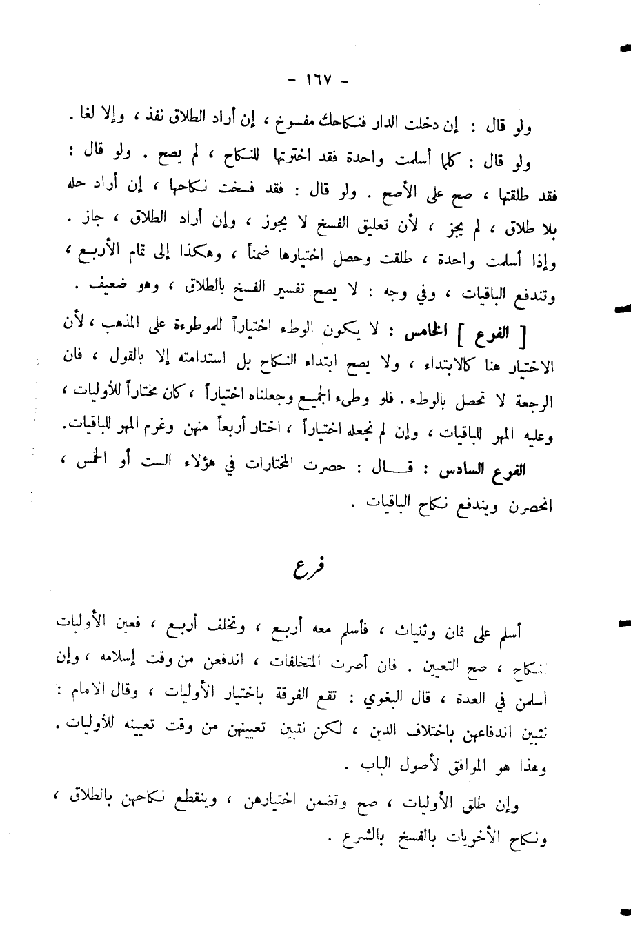 وَلَوْ قَالَ: إِنْ دَخَلْتِ الدَّارَ فَنِكَاحُكِ مَفْسُوخٌ، إِنْ أَرَادَ الطَّلَاقَ نَفَذَ، وَإِلَّا لَغَا. وَلَوْ قَالَ: كُلَّمَا أَسْلَمَتْ وَاحِدَةٌ فَقَدِ اخْتَرْتُهَا لِلنِّكَاحِ، لَمْ يَصِحَّ. وَلَوْ قَالَ: فَقَدْ طَلَّقْتُهَا، صَحَّ عَلَى الْأَصَحِّ. وَلَوْ قَالَ: فَقَدْ فَسَخْتُ نِكَاحَهَا، إِنْ أَرَادَ حَلَّهُ بِلَا طَلَاقٍ، لَمْ يَجُزْ، لِأَنَّ تَعْلِيقَ الْفَسْخِ لَا يَجُوزُ، وَإِنْ أَرَادَ الطَّلَاقَ، جَازَ. وَإِذَا أَسْلَمَتْ وَاحِدَةٌ، طُلِّقَتْ وَحَصَلَ اخْتِيَارُهَا ضِمْنًا، وَهَكَذَا إِلَى تَمَامِ الْأَرْبَعِ، وَتَنْدَفِعُ الْبَاقِيَاتُ، وَفِي وَجْهٍ: لَا يَصِحُّ تَفْسِيرُ الْفَسْخِ بِالطَّلَاقِ، وَهُوَ ضَعِيفٌ.