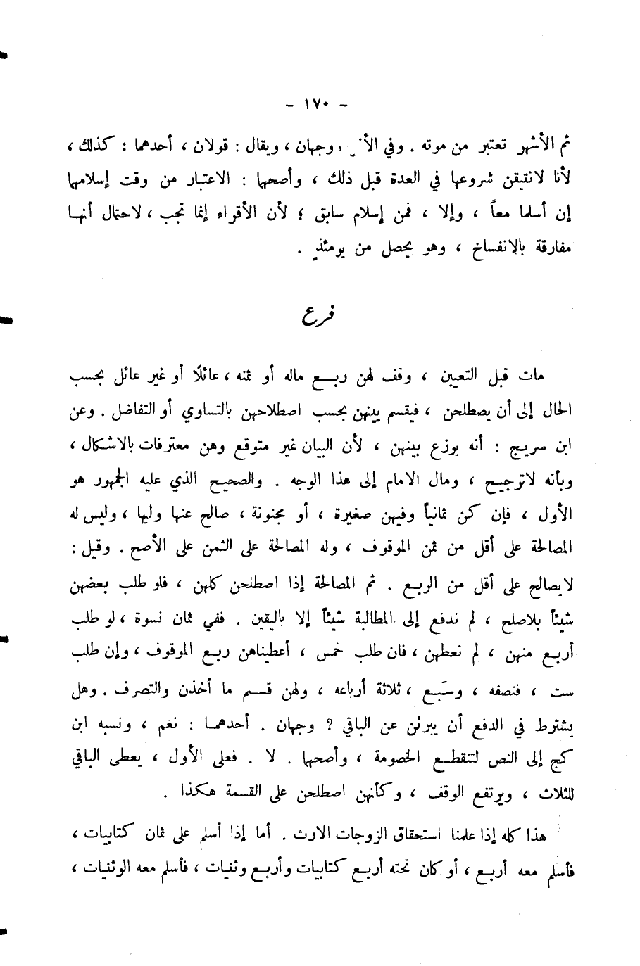 ثُمَّ الْأَشْهُرُ تُعْتَبَرُ مِنْ مَوْتِهِ. وَفِي الْأَقْرَاءِ وَجْهَانِ، وَيُقَالُ: قَوْلَانِ، أَحَدُهُمَا: كَذَلِكَ ; لِأَنَّا لَا نَتَيَقَّنُ شُرُوعَهَا فِي الْعِدَّةِ قَبْلَ ذَلِكَ، وَأَصَحُّهُمَا: الِاعْتِبَارُ مِنْ وَقْتِ إِسْلَامِهِمَا إِنْ أَسْلَمَا مَعًا، وَإِلَّا، فَمِنْ إِسْلَامٍ سَابِقٍ ; لِأَنَّ الْأَقْرَاءَ إِنَّمَا تَجِبُ، لِاحْتِمَالِ أَنَّهَا مُفَارَقَةٌ بِالِانْفِسَاخِ، وَهُوَ يَحْصُلُ مِنْ يَوْمِئِذٍ. فَرْعٌ مَاتَ قَبْلَ التَّعْيِينِ، وُقِفَ لَهُنَّ رُبُعُ مَالِهِ أَوْ ثُمُنُهُ، عَائِلًا أَوْ غَيْرَ عَائِلٍ بِحَسْبِ الْحَالِ إِلَى أَنْ يَصْطَلِحْنَ، فَيُقَسَّمُ بَيْنَهُنَّ بِحَسْبِ اصْطِلَاحِهِنَّ بِالتَّسَاوِي أَوِ التَّفَاضُلِ. وَعَنِ ابْنِ سُرَيْجٍ: أَنَّهُ يُوَزَّعُ بَيْنَهُنَّ ; لِأَنَّ الْبَيَانَ غَيْرُ مُتَوَقَّعٍ وَهُنَّ مُعْتَرِفَاتٌ بِالْإِشْكَالِ، وَبِأَنَّهُ لَا تَرْجِيحَ، وَمَالَ الْإِمَامُ إِلَى هَذَا الْوَجْهِ. وَالصَّحِيحُ الَّذِي عَلَيْهِ الْجُمْهُورُ هُوَ الْأَوَّلُ، فَإِنْ كُنَّ ثَمَانِيًا وَفِيهِنَّ صَغِيرَةٌ، أَوْ مَجْنُونَةٌ، صَالَحَ عَنْهَا وَلِيُّهَا، وَلَيْسَ لَهُ الْمُصَالَحَةُ عَلَى أَقَلِّ مِنْ ثُمُنِ الْمَوْقُوفِ، وَلَهُ الْمُصَالَحَةُ عَلَى الثُّمُنِ عَلَى الْأَصَحِّ. وَقِيلَ: لَا يُصَالِحُ عَلَى أَقَلِّ مِنَ الرُّبْعِ. ثُمَّ الْمُصَالَحَةُ إِذَا اصْطَلَحْنَ كُلُّهُنَّ، فَلَوْ طَلَبَ بَعْضُهُنَّ شَيْئًا بِلَا صُلْحٍ، لَمْ نَدْفَعْ إِلَى الْمُطَالَبَةِ شَيْئًا إِلَّا بِالْيَقِينِ. فَفِي ثَمَانِ نِسْوَةٍ، لَوْ طَلَبَ أَرْبَعٌ مِنْهُنَّ، لَمْ نُعْطِهِنَّ، فَإِنْ طَلَبَ خَمْسٌ، أَعْطَيْنَاهُنَّ رُبْعَ الْمَوْقُوفِ، وَإِنْ طَلَبَ سِتٌّ، فَنِصْفُهُ، وَسَبْعٌ، ثَلَاثَةُ أَرْبَاعِهِ، وَلَهُنَّ قَسْمُ مَا أَخَذْنَ وَالتَّصَرُّفُ. وَهَلْ يُشْتَرَطُ فِي الدَّفْعِ أَنْ يُبَرَّئْنَ عَنِ الْبَاقِي؟ وَجْهَانِ. أَحَدُهُمَا: أَعَمُّ، وَنَسَبَهُ ابْنُ كَجٍّ إِلَى النَّصِّ لِتَنْقَطِعَ الْخُصُومَةُ، وَأَصَحُّهُمَا: لَا. فَعَلَى الْأَوَّلِ، يُعْطَى الْبَاقِي لِلثَّلَاثِ، وَيَرْتَفِعُ الْوَقْفُ، وَكَأَنَّهُنَّ اصْطَلَحْنَ عَلَى الْقِسْمَةِ هَكَذَا.
