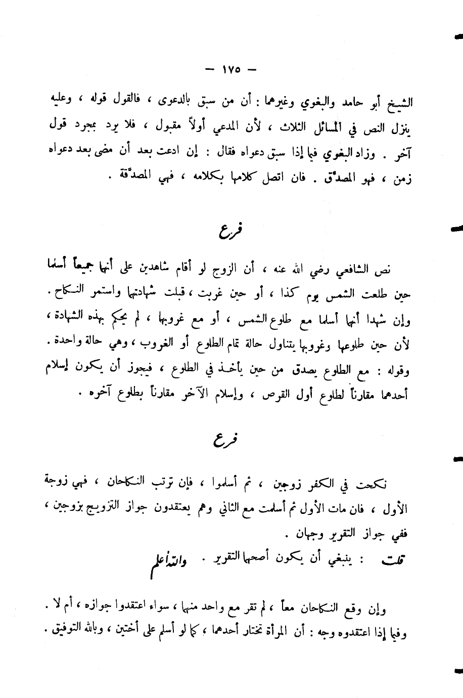 نَصَّ الشَّافِعِيُّ، رَضِيَ اللَّهُ عَنْهُ، أَنَّ الزَّوْجَ لَوْ أَقَامَ شَاهِدَيْنِ عَلَى أَنَّهُمَا جَمِيعًا أَسْلَمَا حِينَ طَلَعَتِ الشَّمْسُ يَوْمَ كَذَا، أَوْ حِينَ غَرَبَتْ، قُبِلَتْ شَهَادَتُهُمَا وَاسْتَمَرَّ النِّكَاحُ. وَإِنْ شَهِدَا أَنَّهُمَا أَسْلَمَا مَعَ طُلُوعِ الشَّمْسِ، أَوْ مَعَ غُرُوبِهَا، لَمْ يُحْكُمْ بِهَذِهِ الشَّهَادَةِ ; لِأَنَّ حِينَ طُلُوعِهَا وَغُرُوبِهَا يَتَنَاوَلُ حَالَةَ تَمَامِ الطُّلُوعِ أَوِ الْغُرُوبِ، وَهِيَ حَالَةٌ وَاحِدَةٌ. وَقَوْلُهُ: مَعَ الطُّلُوعِ يُصَدَّقُ مِنْ حِينِ يَأْخُذُ فِي الطُّلُوعِ، فَيَجُوزُ أَنْ يَكُونَ إِسْلَامُ أَحَدِهِمَا مُقَارِنًا لِطُلُوعِ أَوَّلِ الْقُرْصِ، وَإِسْلَامُ الْآخَرِ مُقَارِنًا بِطُلُوعِ آخِرِهِ.
