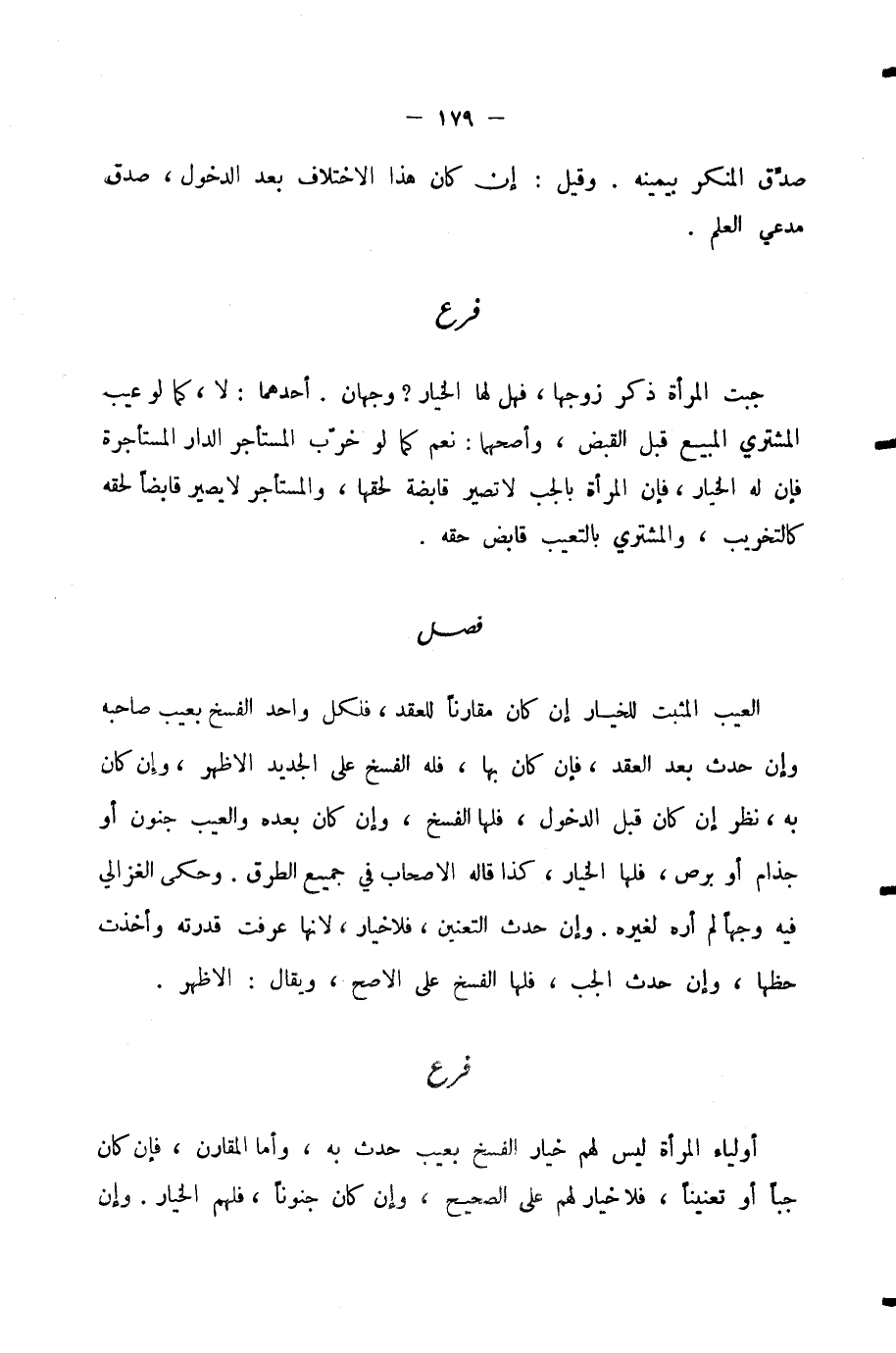 الْعَيْبُ الْمُثْبِتُ لِلْخِيَارِ إِنْ كَانَ مُقَارِنًا لِلْعَقْدِ، فَلِكُلِّ وَاحِدٍ الْفَسْخُ بِعَيْبِ صَاحِبِهِ وَإِنْ حَدَثَ بَعْدَ الْعَقْدِ، فَإِنْ كَانَ بِهَا، فَلَهُ الْفَسْخُ عَلَى الْجَدِيدِ الْأَظْهَرِ، وَإِنْ كَانَ بِهِ، نُظِرَ إِنْ كَانَ قَبْلَ الدُّخُولِ، فَلَهَا الْفَسْخُ، وَإِنْ كَانَ بَعْدَهُ وَالْعَيْبُ جُنُونٌ أَوْ جُذَامٌ أَوْ بَرَصٌ، فَلَهَا الْخِيَارُ، كَذَا قَالَهُ الْأَصْحَابُ فِي جَمِيعِ الطُّرُقِ. وَحَكَى الْغَزَالِيُّ فِيهِ وَجْهًا لَمْ أَرَهُ لِغَيْرِهِ. وَإِنْ حَدَثَ التَّعْنِينُ، فَلَا خِيَارَ ; لِأَنَّهَا عَرَفَتْ قُدْرَتَهُ وَأَخَذَتْ حَظَّهَا، وَإِنْ حَدَثَ الْجَبُّ، فَلَهَا الْفَسْخُ عَلَى الْأَصَحِّ، وَيُقَالُ: الْأَظْهَرُ.