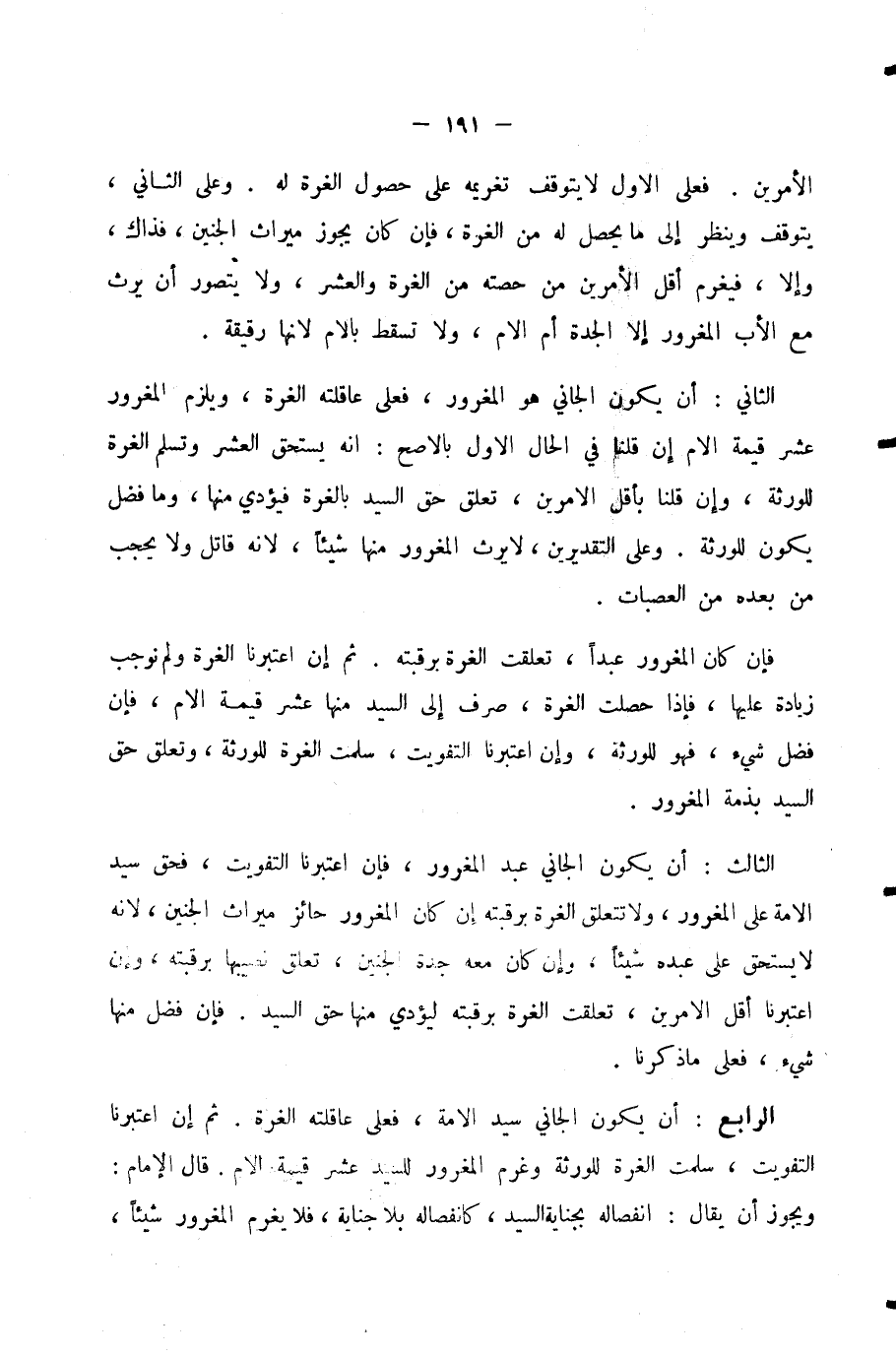 الثَّانِي: أَنْ يَكُونَ الْجَانِي هُوَ الْمَغْرُورُ، فَعَلَى عَاقِلَتِهِ الْغُرَّةُ، وَيَلْزَمُ الْمَغْرُورَ عُشْرُ قِيمَةِ الْأُمِّ إِنْ قُلْنَا فِي الْحَالِ الْأَوَّلِ بِالْأَصَحِّ: أَنَّهُ يَسْتَحِقُّ الْعُشْرَ وَتُسَلَّمُ الْغُرَّةُ لِلْوَرَثَةِ، وَإِنْ قُلْنَا بِأَقَلِّ الْأَمْرَيْنِ، تَعَلَّقَ حَقُّ السَّيِّدِ بِالْغُرَّةِ فَيُؤَدِّي مِنْهَا، وَمَا فَضَلَ يَكُونُ لِلْوَرَثَةِ. وَعَلَى التَّقْدِيرَيْنِ، لَا يَرِثُ الْمَغْرُورُ مِنْهَا شَيْئًا ; لِأَنَّهُ قَاتِلٌ وَلَا يَحْجِبُ مَنْ بَعْدَهُ مِنَ الْعَصَبَاتِ.