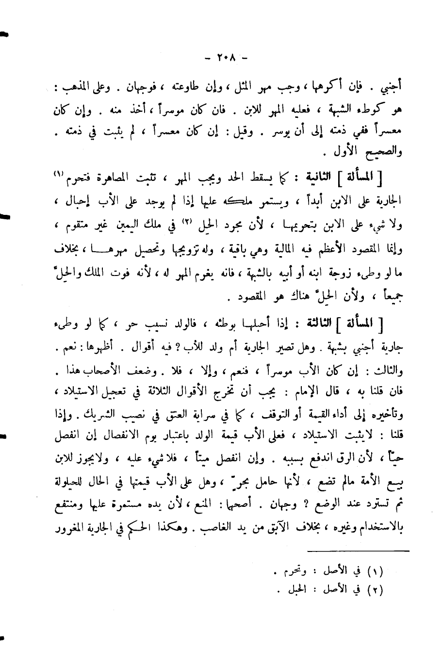 الْمَسْأَلَةُ الثَّانِيَةُ: كَمَا يَسْقُطُ الْحَدُّ وَيَجِبُ الْمَهْرُ، تَثْبُتُ الْمُصَاهَرَةُ فَتَحْرُمُ الْجَارِيَةُ عَلَى الِابْنِ أَبَدًا، وَيَسْتَمِرُّ مِلْكُهُ عَلَيْهَا إِذَا لَمْ يُوجَدْ عَلَى الْأَبِ إِحْبَالٌ، وَلَا شَيْءَ عَلَى الِابْنِ بِتَحْرِيمِهَا ; لِأَنَّ مُجَرَّدَ الْحِلِّ فِي مِلْكِ الْيَمِينِ غَيْرُ مُتَقَوِّمٍ، وَإِنَّمَا الْمَقْصُودُ الْأَعْظَمُ فِيهِ الْمَالِيَّةُ وَهِيَ بَاقِيَةٌ، وَلَهُ تَزْوِيجُهَا وَتَحْصِيلُ مَهْرِهَا، بِخِلَافِ مَا لَوْ وَطِئَ زَوْجَةَ ابْنِهِ أَوْ أَبِيهِ بِالشُّبْهَةِ، فَإِنَّهُ يُغَرَّمُ الْمَهْرَ لَهُ ; لِأَنَّهُ فَوَّتَ الْمِلْكَ وَالْحِلَّ جَمِيعًا، وَلِأَنَّ الْحِلَّ هُنَاكَ هُوَ الْمَقْصُودُ.