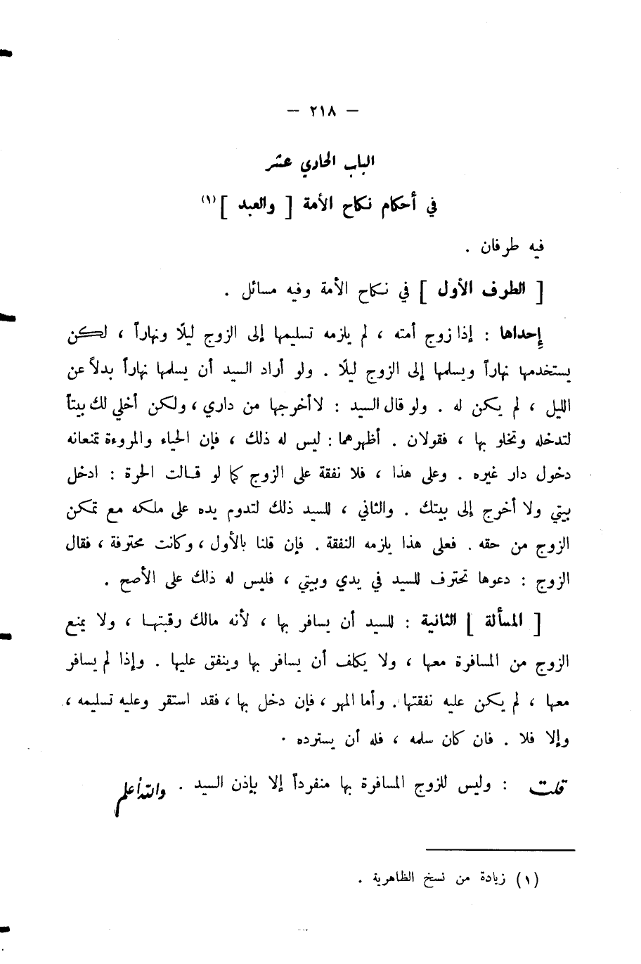 قُلْتُ: وَلَيْسَ لِلزَّوْجِ الْمُسَافِرَةُ بِهَا مُنْفَرِدًا إِلَّا بِإِذْنِ السَّيِّدِ. وَاللَّهُ أَعْلَمُ.