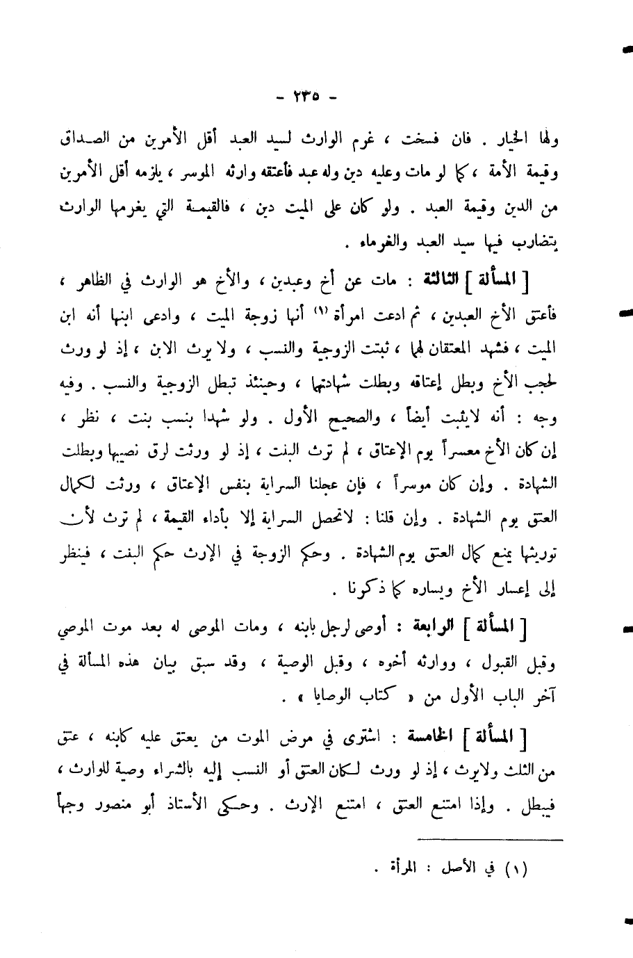 [الْمَسْأَلَةُ] الثَّالِثَةُ: مَاتَ عَنْ أَخٍ وَعَبْدَيْنِ، وَالْأَخُ هُوَ الْوَارِثُ فِي الظَّاهِرِ، فَأَعْتَقَ الْأَخُ الْعَبْدَيْنِ، ثُمَّ ادَّعَتِ امْرَأَةٌ أَنَّهَا زَوْجَةُ الْمَيِّتِ، وَادَّعَى ابْنُهَا أَنَّهُ ابْنُ الْمَيِّتِ، فَشَهِدَ الْمُعَتَقَانِ لَهُمَا، ثَبَتَتِ الزَّوْجِيَّةُ وَالنَّسَبُ، وَلَا يَرِثُ الِابْنُ، إِذْ لَوْ وَرِثَ لَحَجَبَ الْأَخَ وَبَطَلَ إِعْتَاقُهُ وَبَطَلَتْ شَهَادَتُهُمَا، وَحِينَئِذٍ تَبْطُلُ الزَّوْجِيَّةُ وَالنِّسَبُ. وَفِيهِ وَجْهٌ: أَنَّهُ لَا يَثْبُتُ أَيْضًا، وَالصَّحِيحُ الْأَوَّلُ.