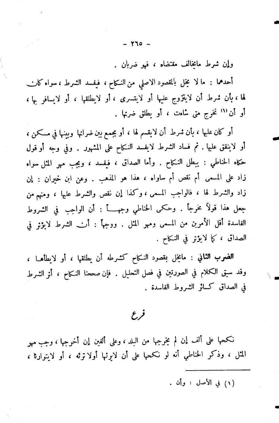 وَإِنْ شَرَطَ مَا يُخَالِفُ مُقْتَضَاهُ، فَهُوَ ضَرْبَانِ. أَحَدُهُمَا: مَا لَا يُخِلُّ بِالْمَقْصُودِ الْأَصْلِيِّ مِنَ النِّكَاحِ، فَيَفْسُدُ الشَّرْطُ، سَوَاءٌ كَانَ لَهَا، بِأَنْ شَرَطَ أَنْ لَا يَتَزَوَّجَ عَلَيْهَا أَوْ لَا يَتَسَرَّى، أَوْ يُطَلِّقَهَا، أَوْ لَا يُسَافِرَ بِهَا، أَوْ أَنْ تَخْرُجَ مَتَى شَاءَتْ، أَوْ يُطَلِّقَ ضَرَّتَهَا.